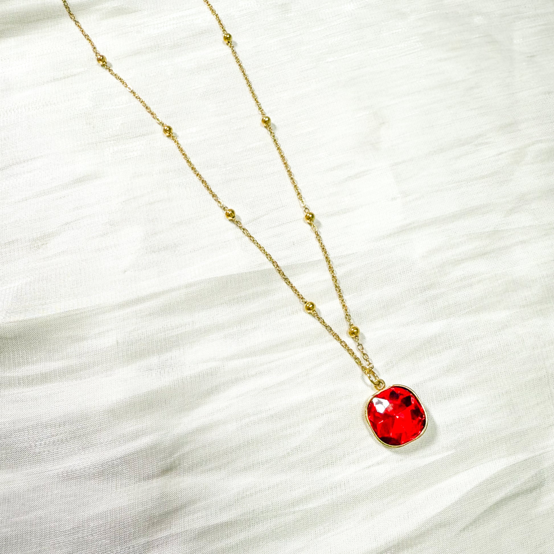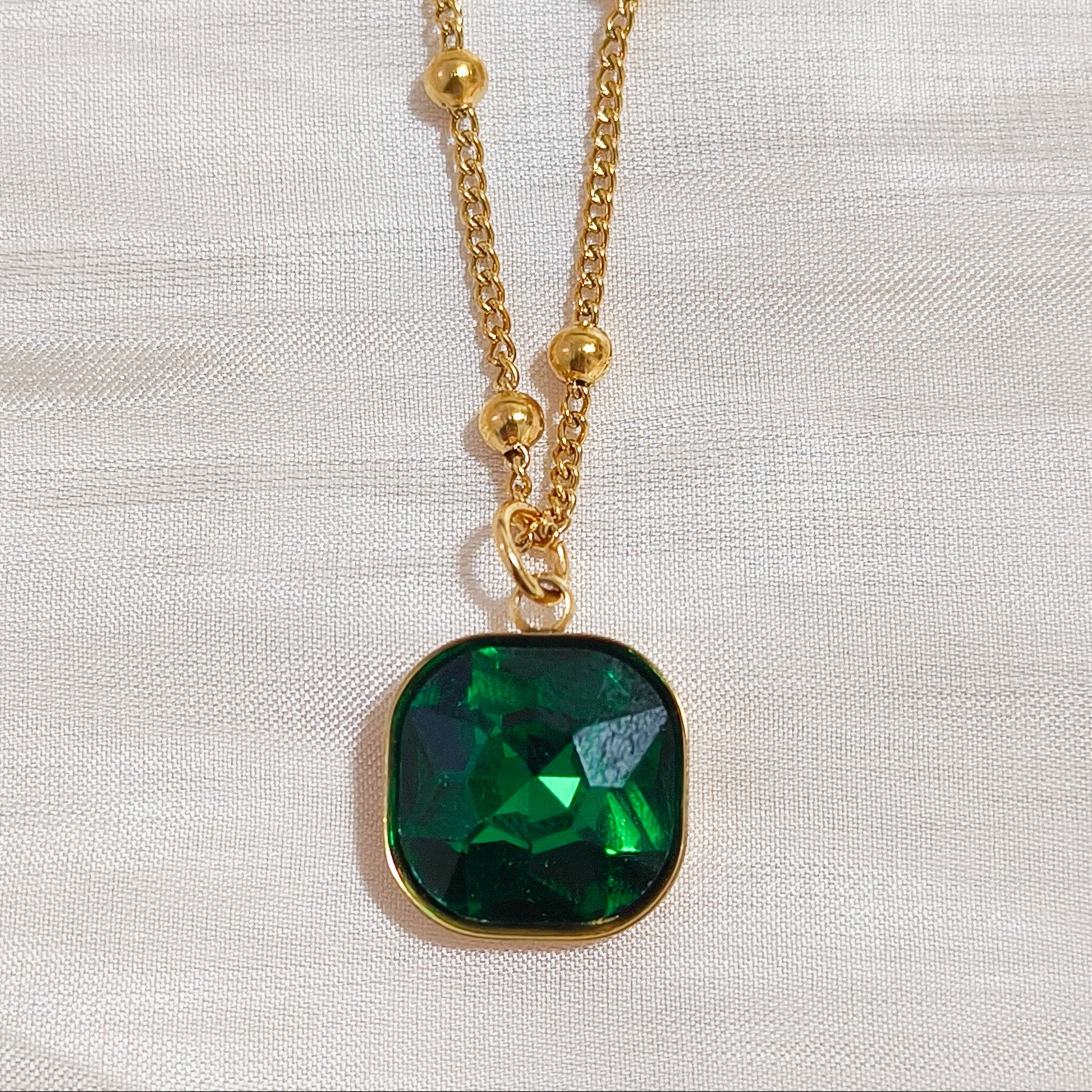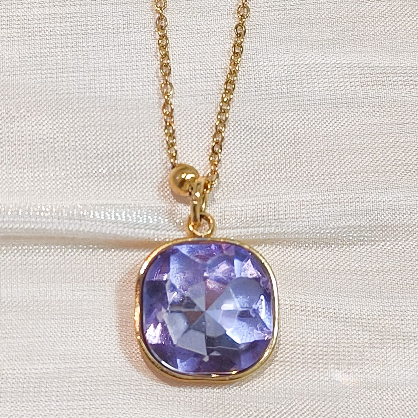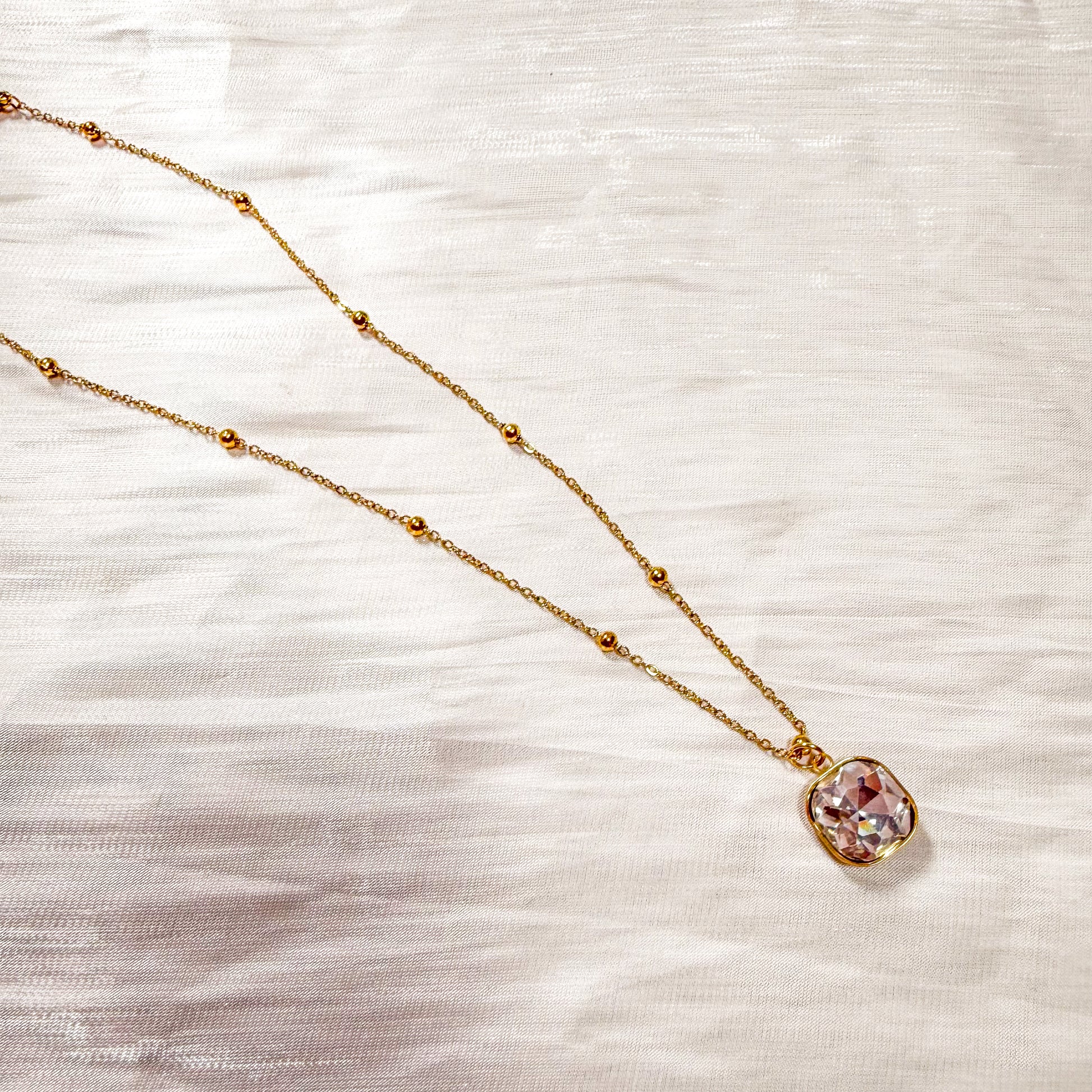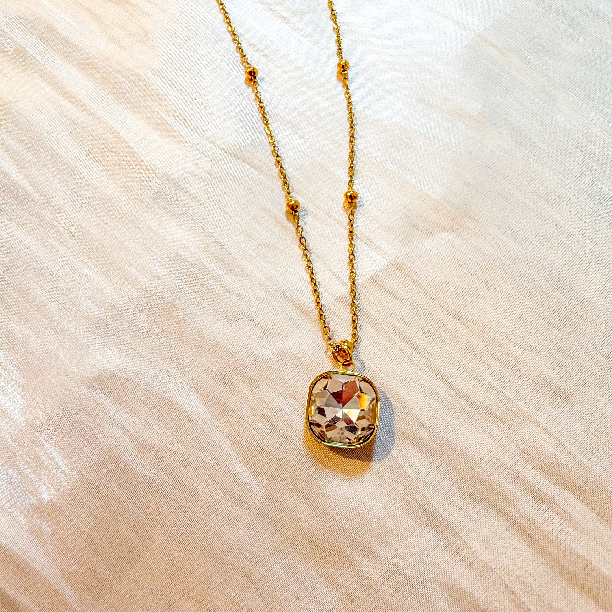 - Cadena finita con bolitas doradas y un cristal de fantasía cuadrado disponible en lila, rosa o verde.