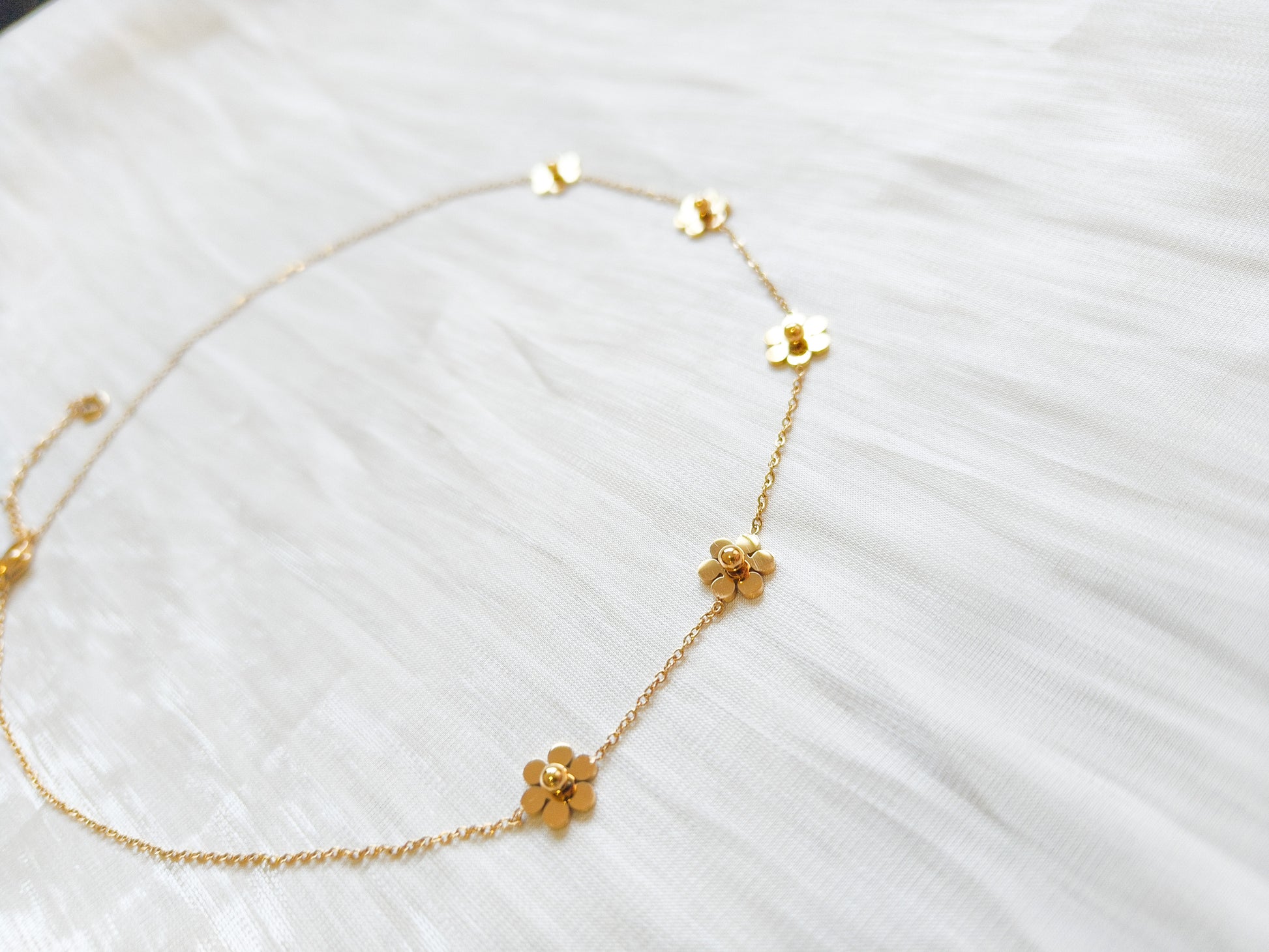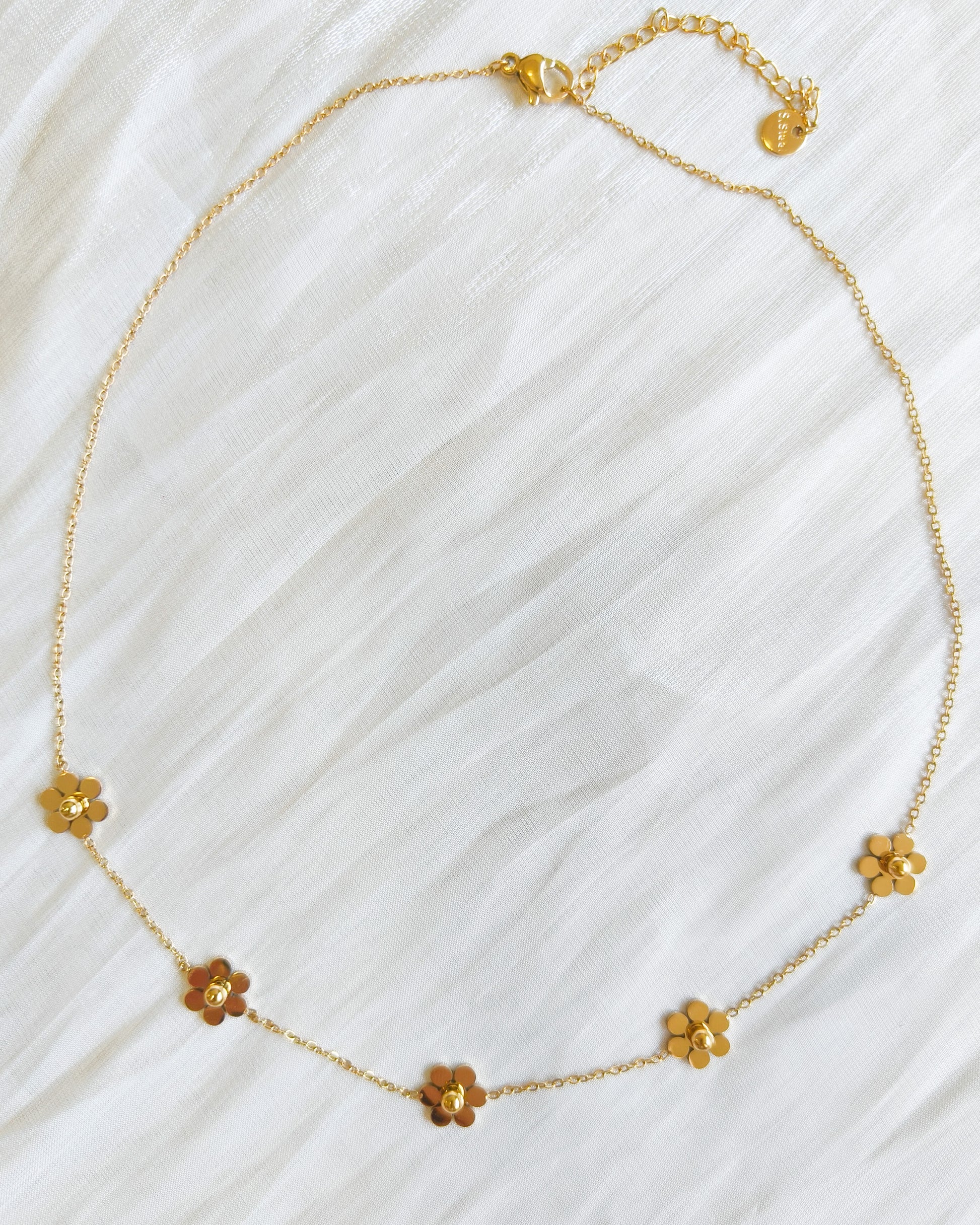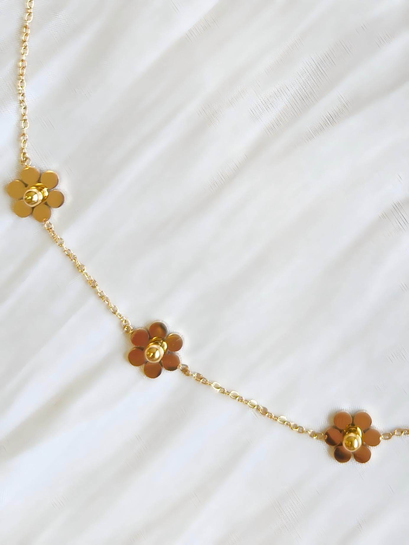 Descripción: Cinco florecitas doradas sobre cadena fina de acero inoxidable; delicado y femenino. Un toque brillante que realza cualquier look.