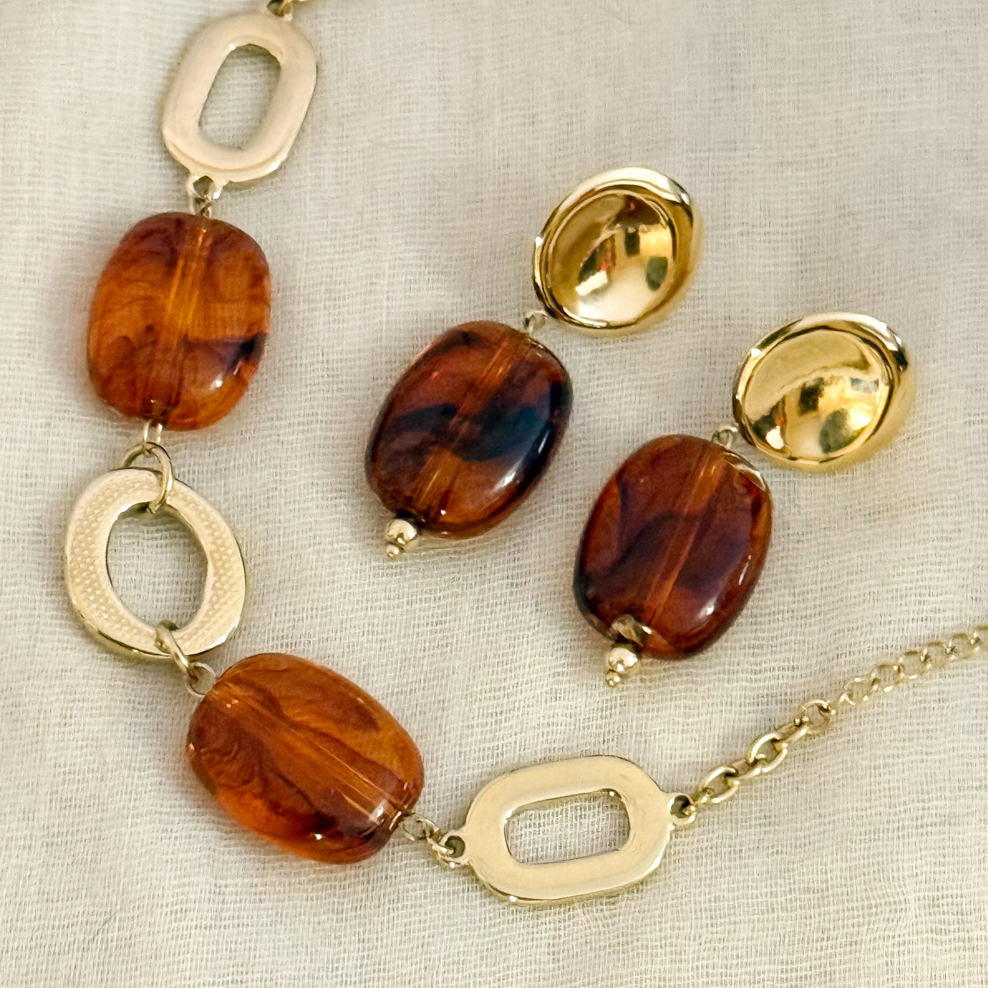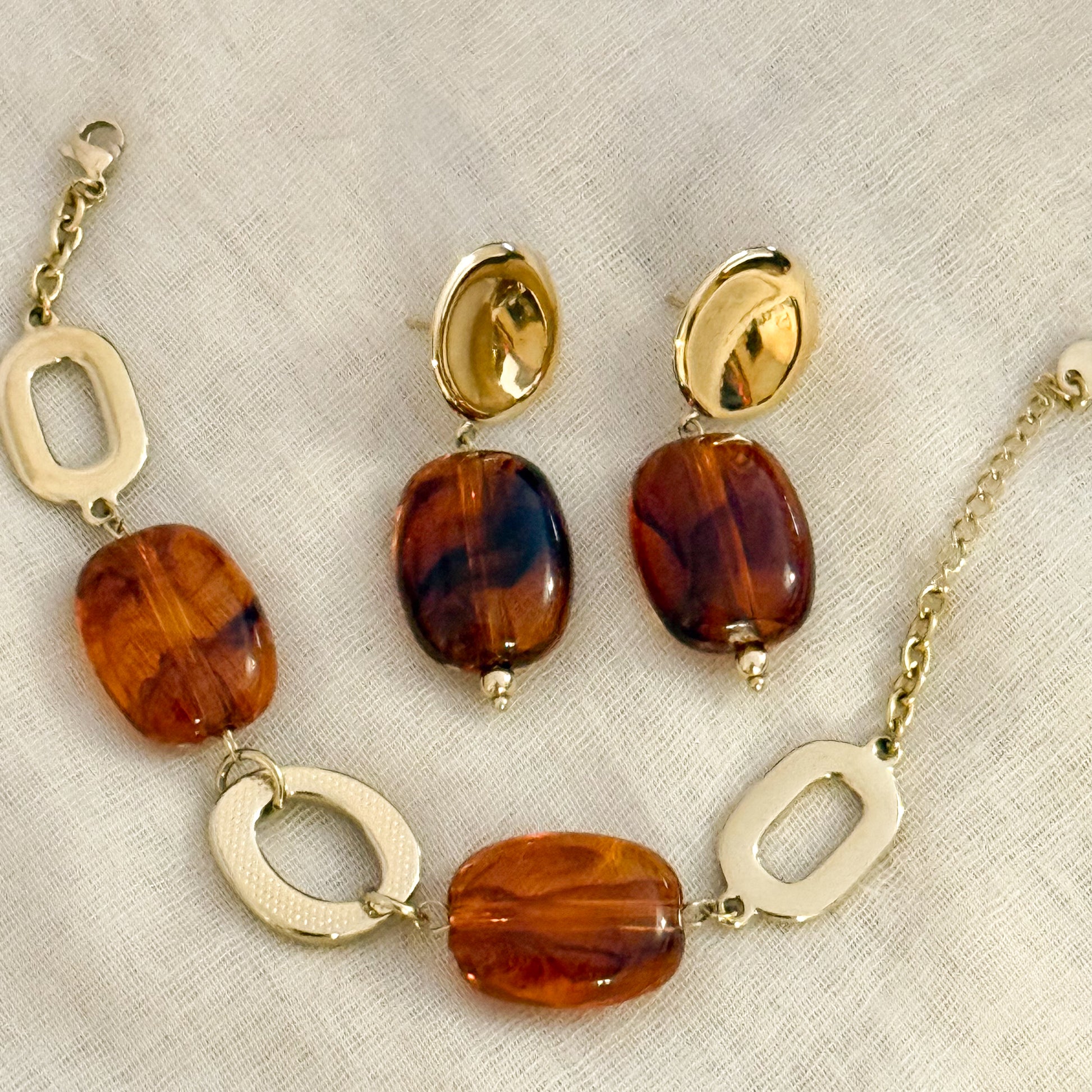 Inspirado en la calidez del ámbar y el brillo del dorado, este conjunto combina texturas suaves y formas geométricas que reflejan la luz con un encanto especial.