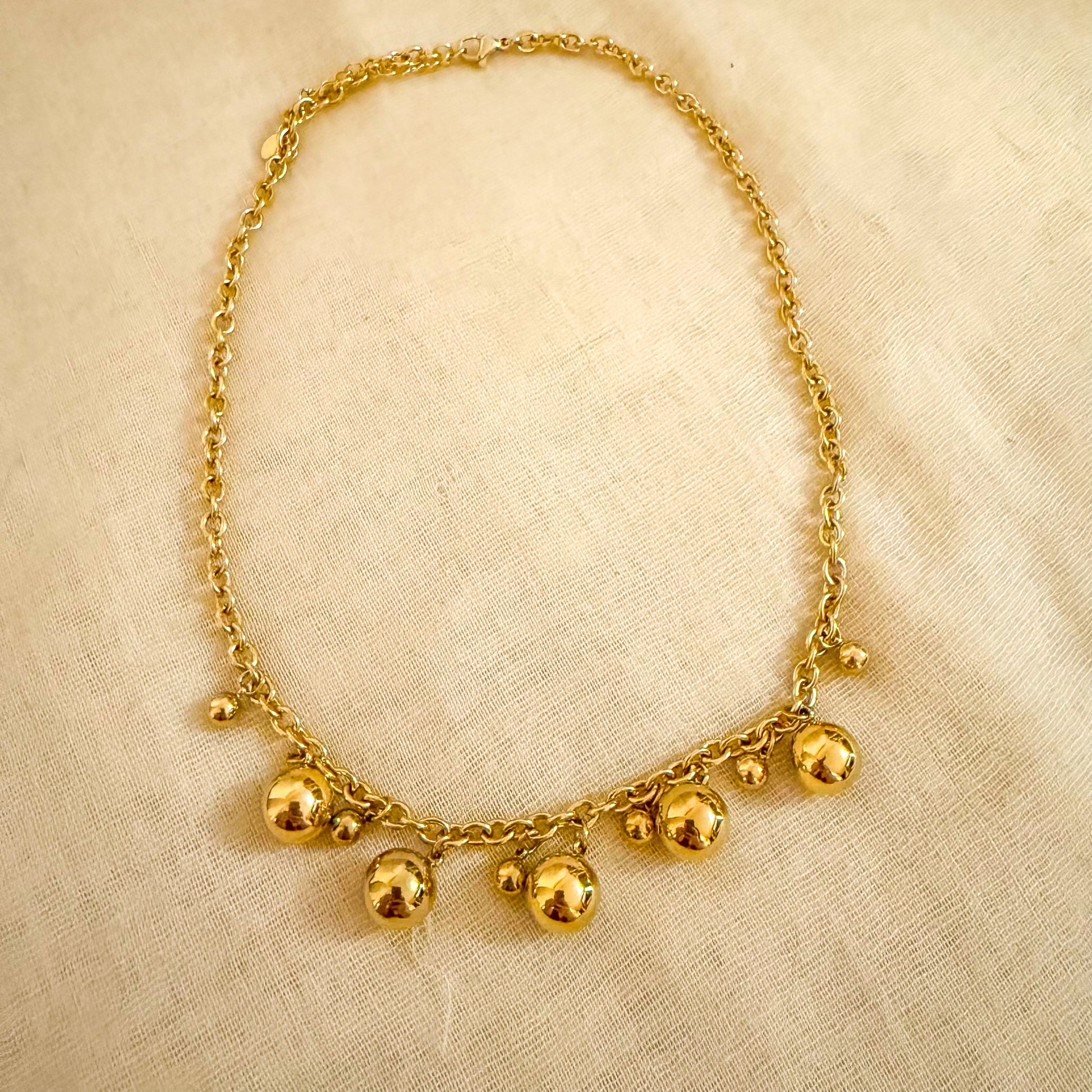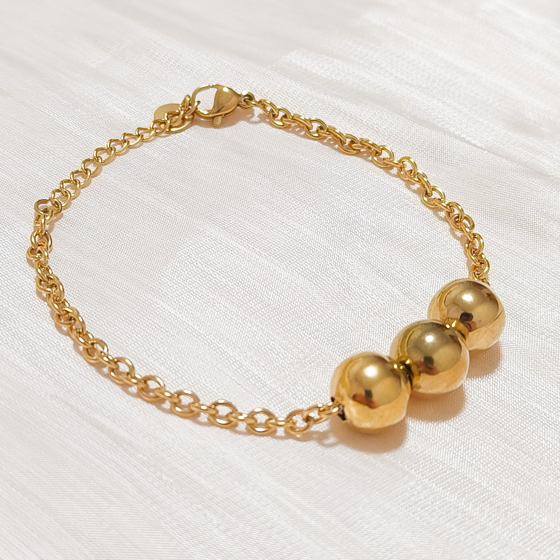 La cadena fina dorada se adorna con pequeñas esferas pulidas que se balancean suavemente, creando un efecto elegante y femenino en cada gesto.