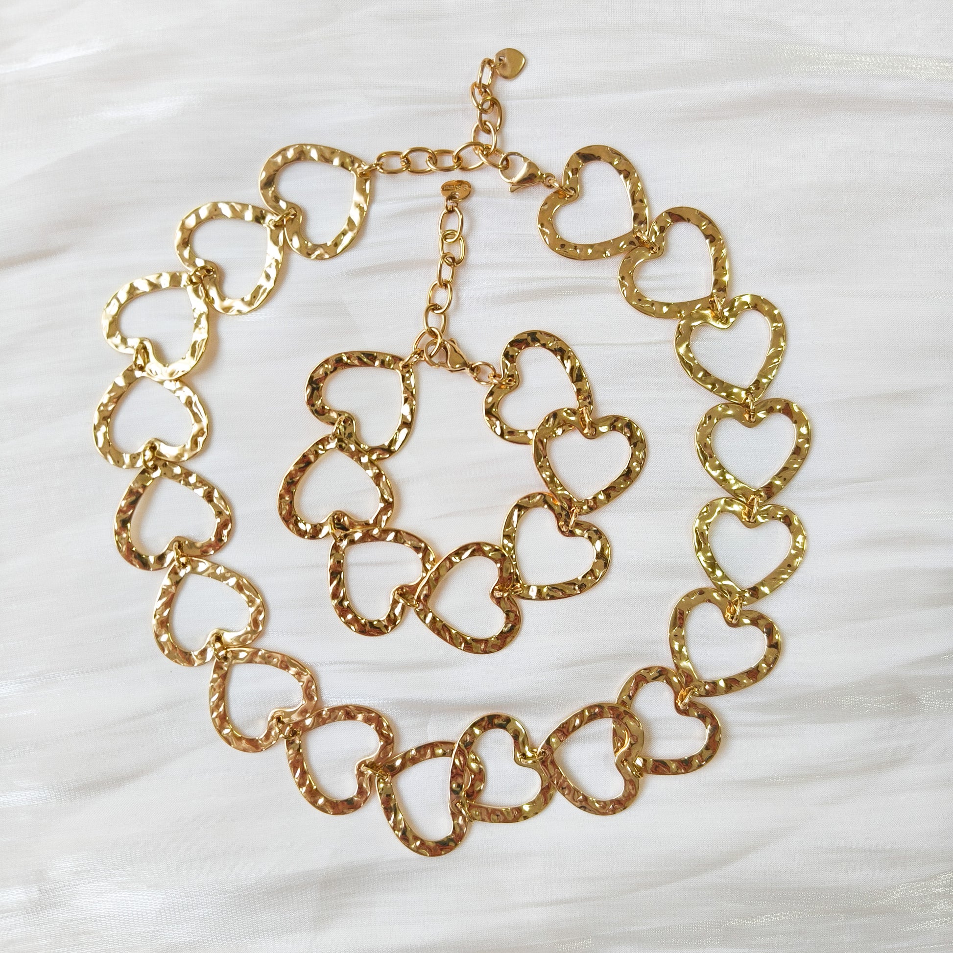 - Cadena de corazones martillados dorados en collar y pulsera: luminoso, femenino y súper vistoso.