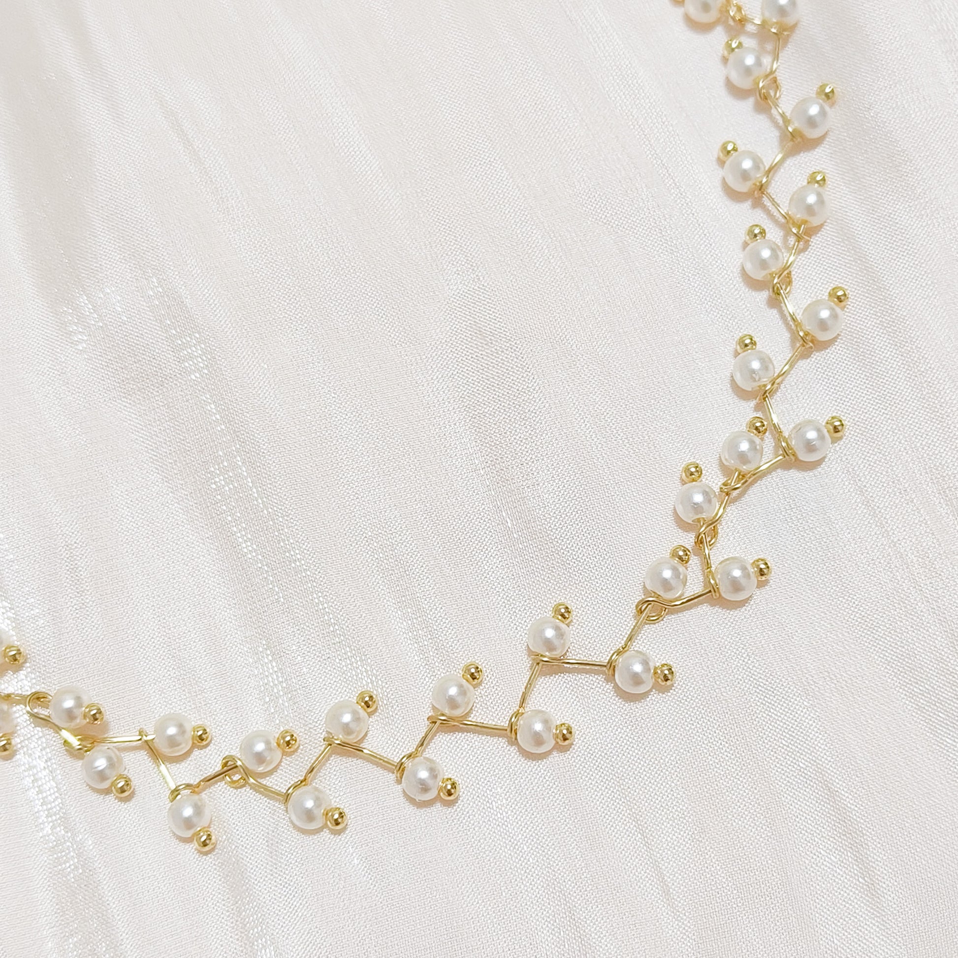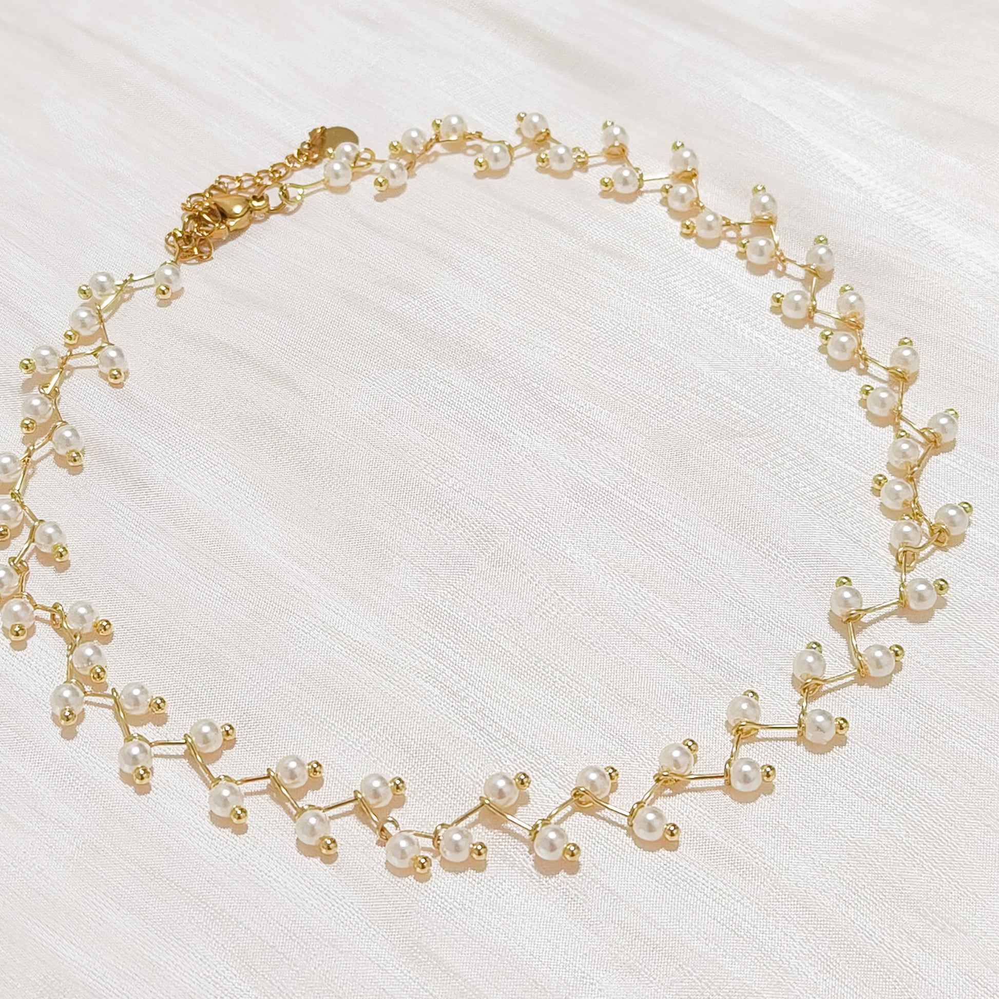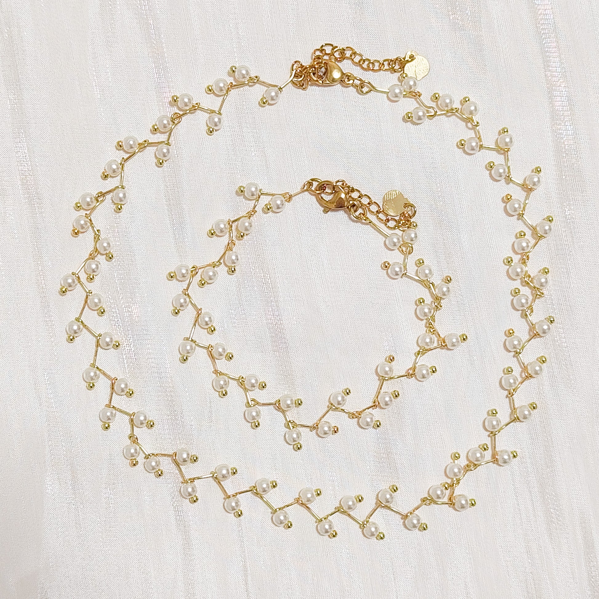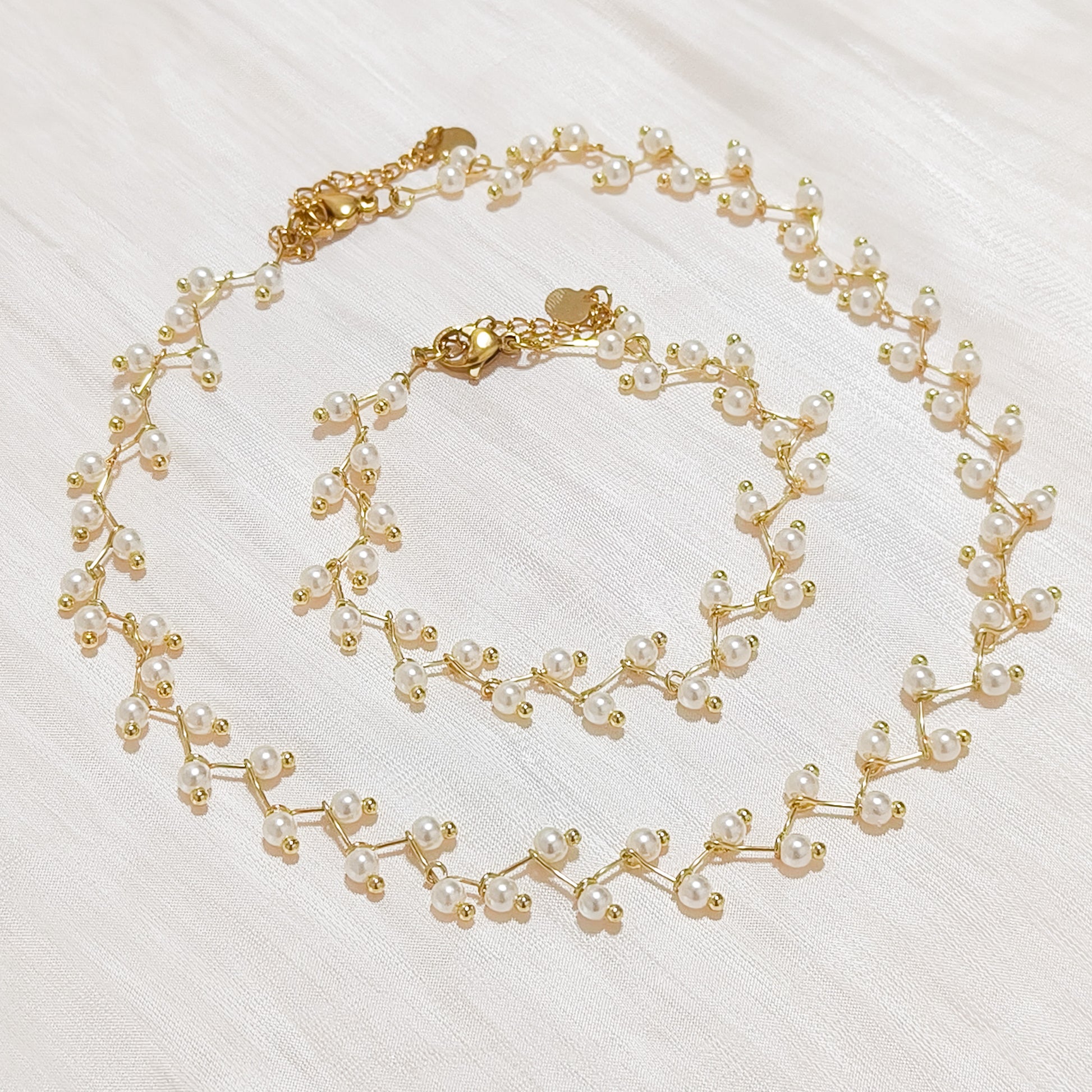 Collar corto y pulsera lleno de pequeñas perlas de fantasía que se entrelazan como ramitas en flor alrededor del cuello.