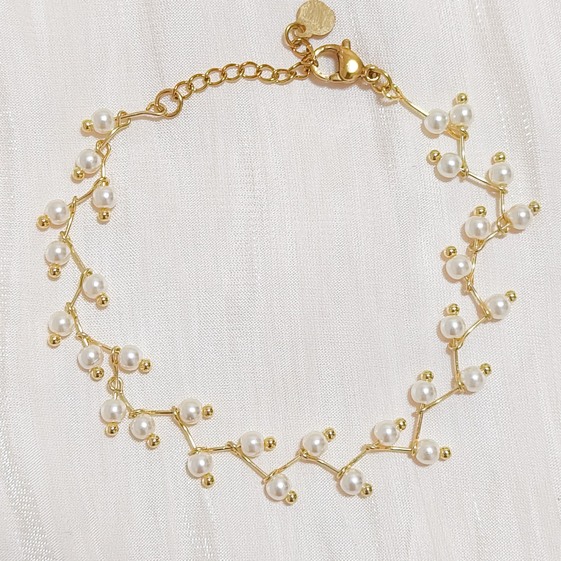 Perlas sintéticas pequeñas, montadas en finos hilos metálicos.