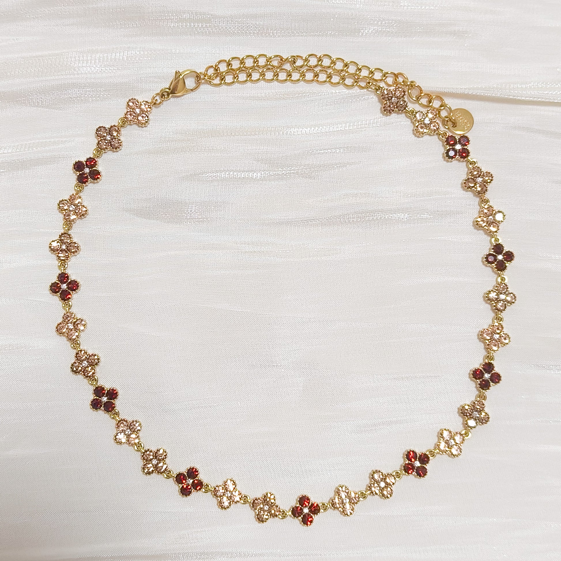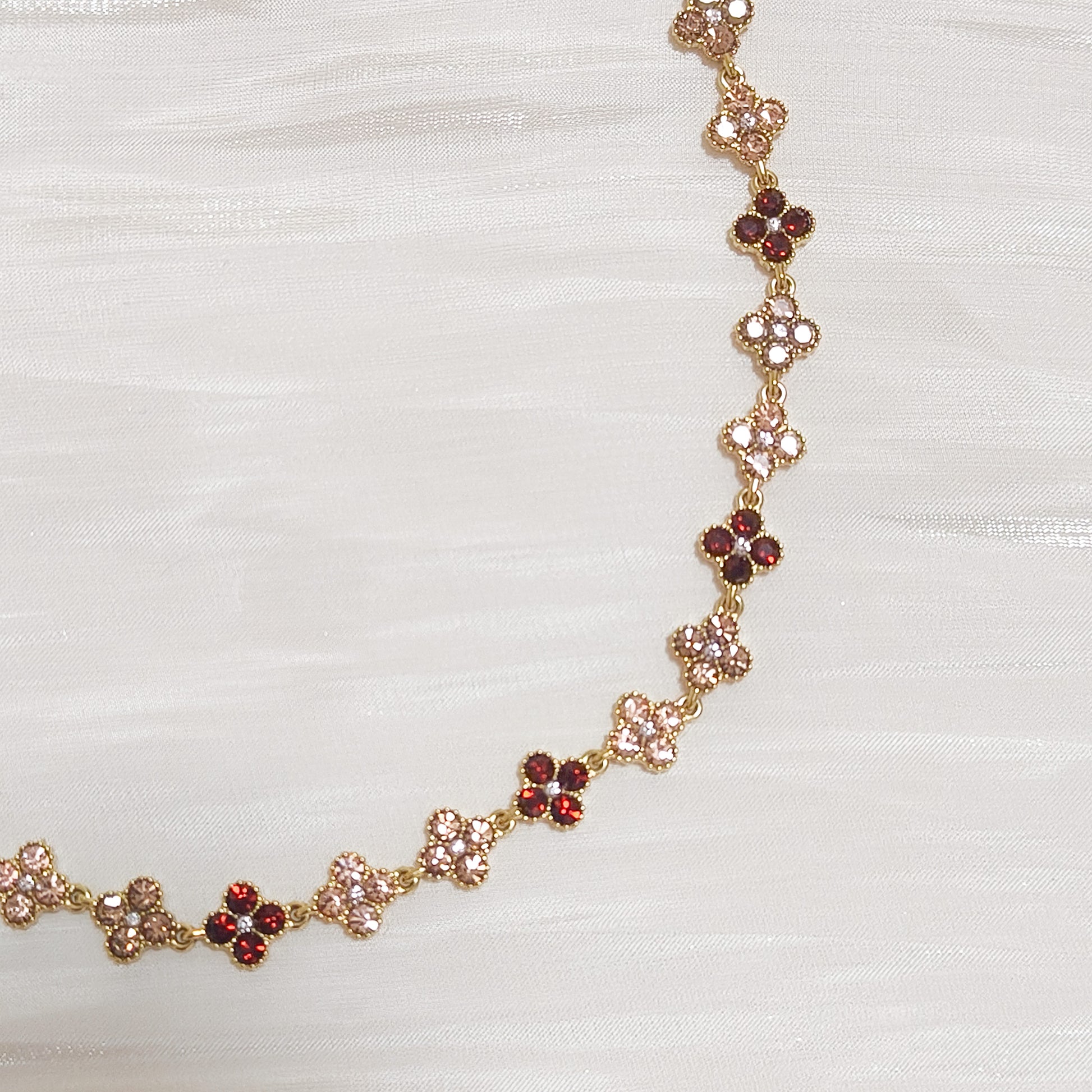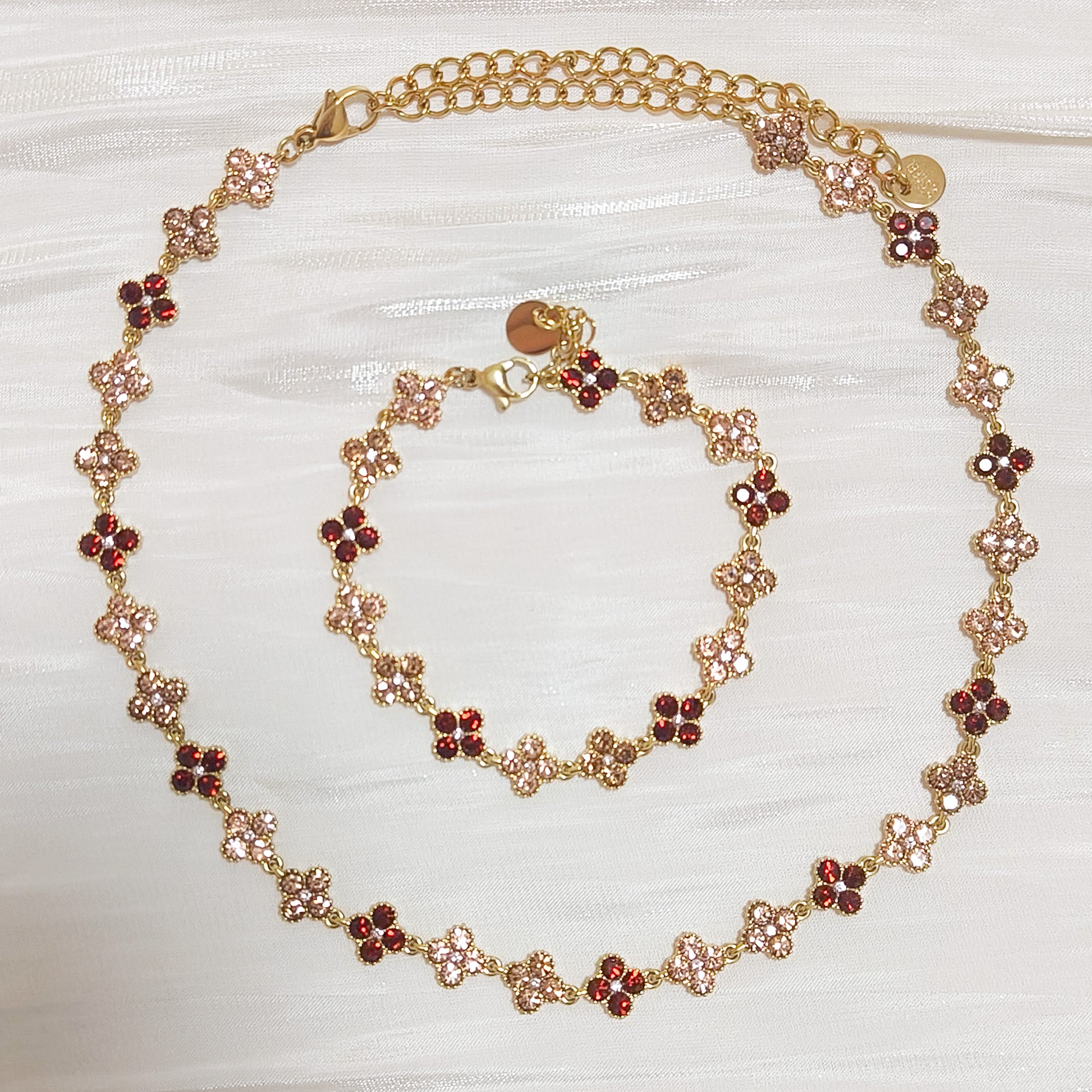 - Collar corto y pulsera lleno de pequeñas flores doradas con cristalitos rojos y rosas nudos, delicado y súper brillante.