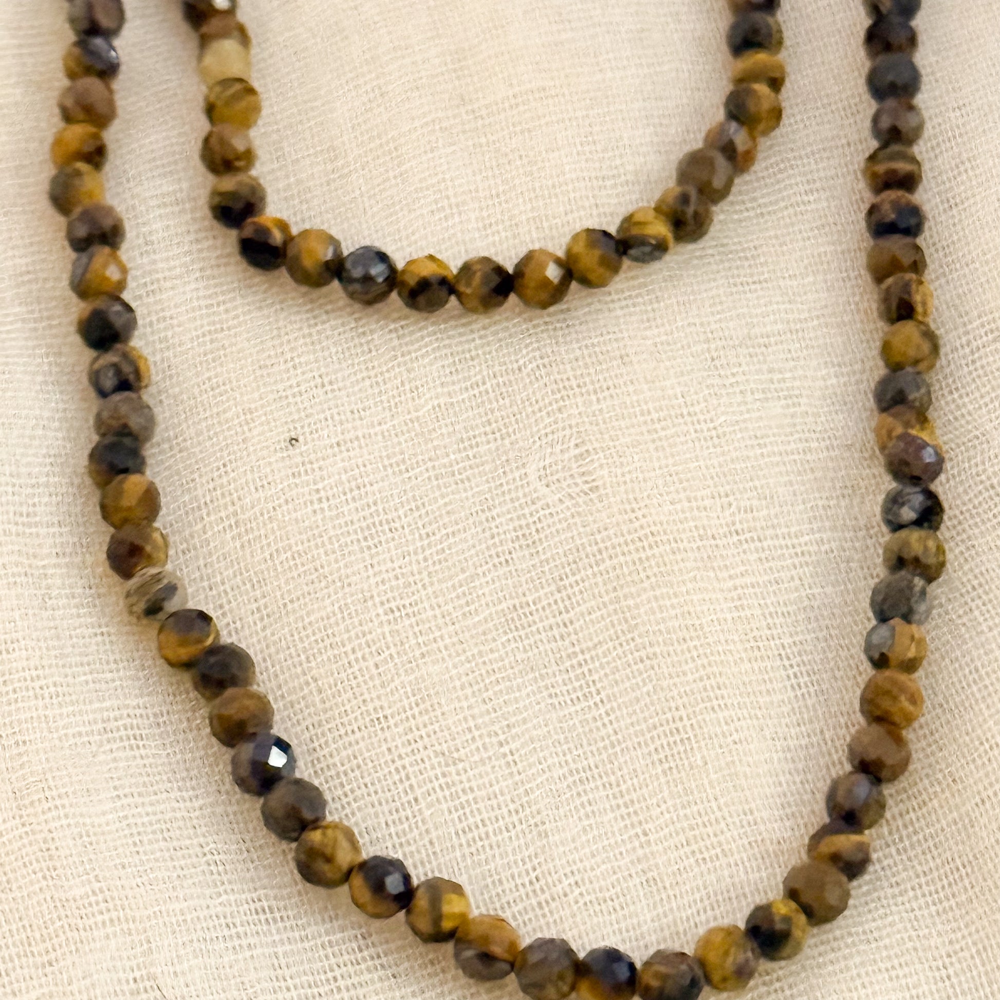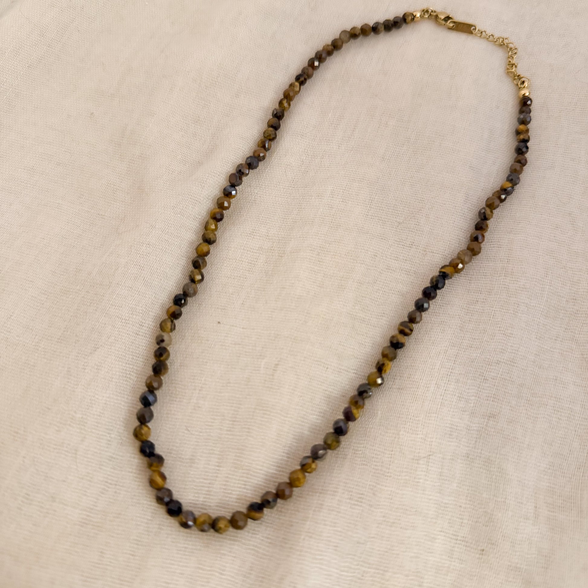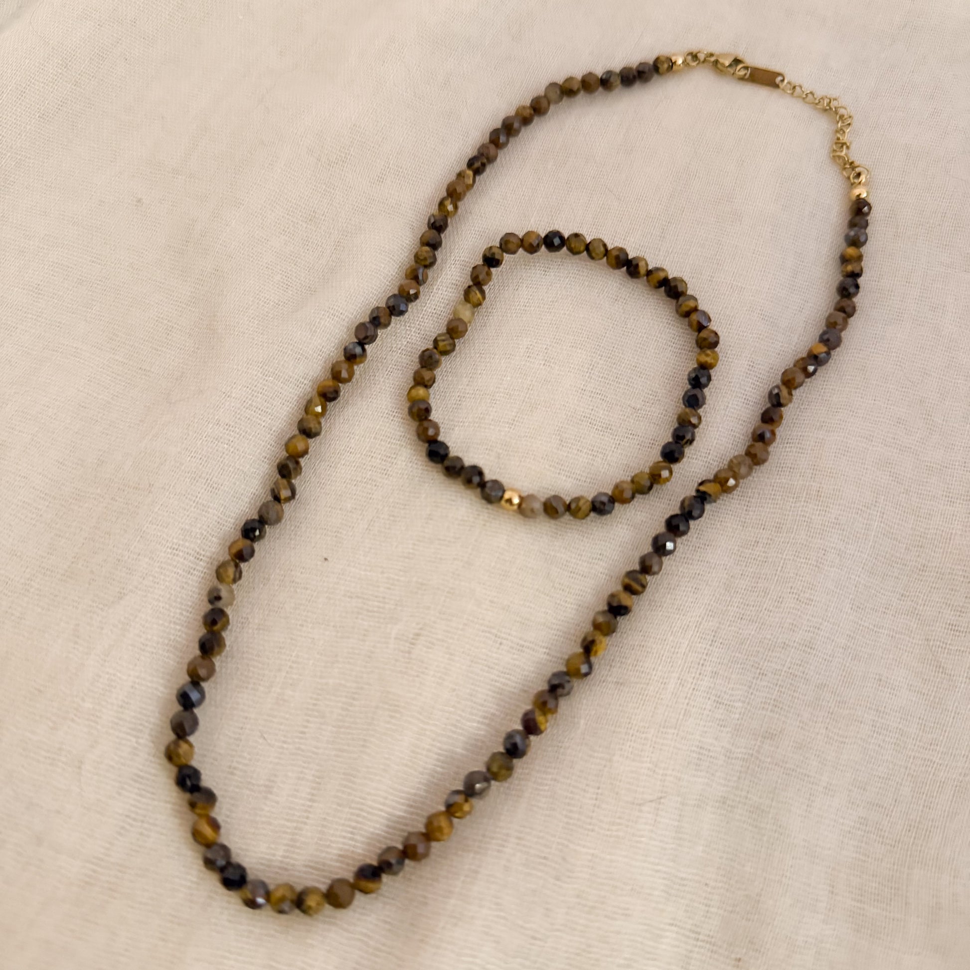 Las cuentas facetadas en tonos marrones evocan el ojo del desierto — profundo, cálido y lleno de energía interior.
