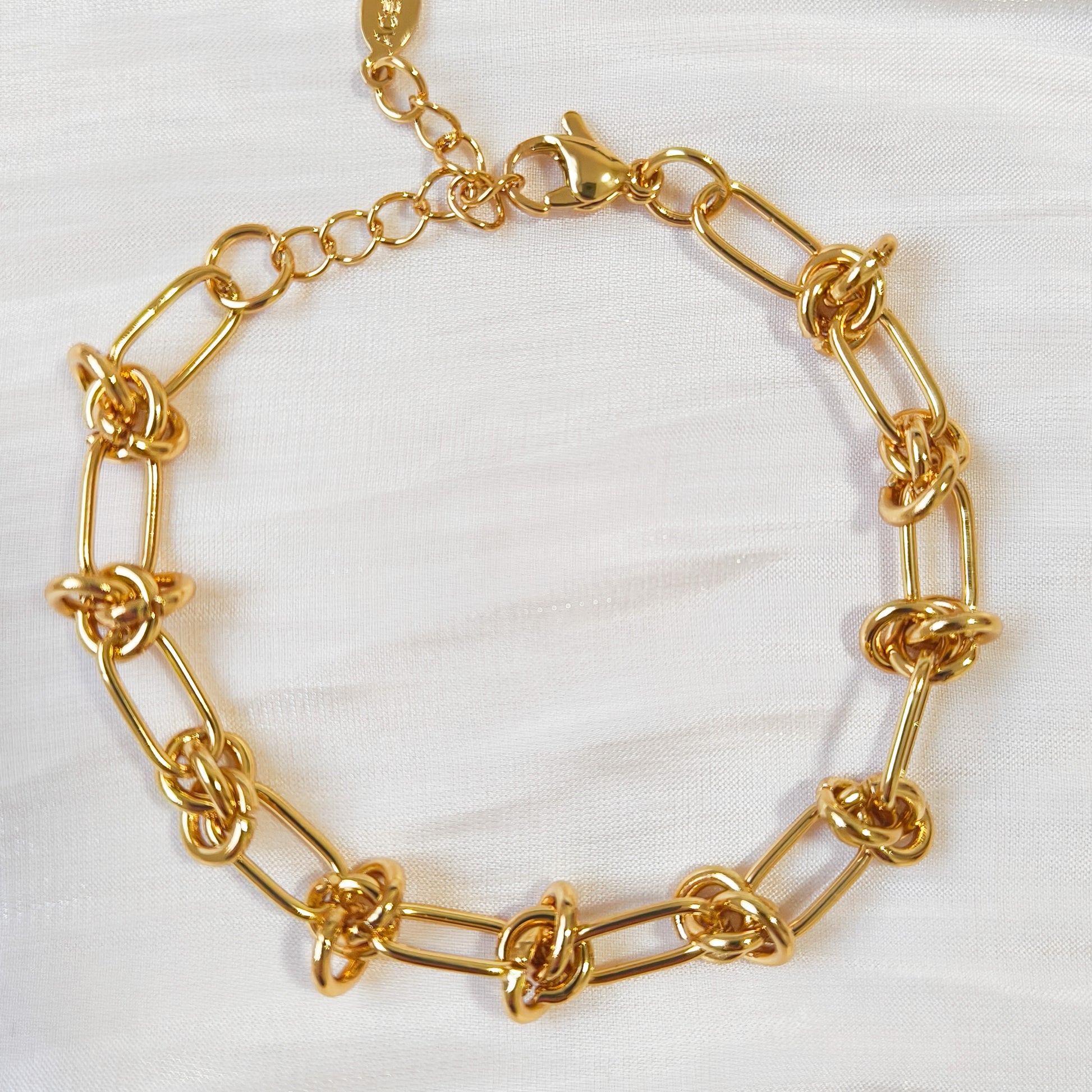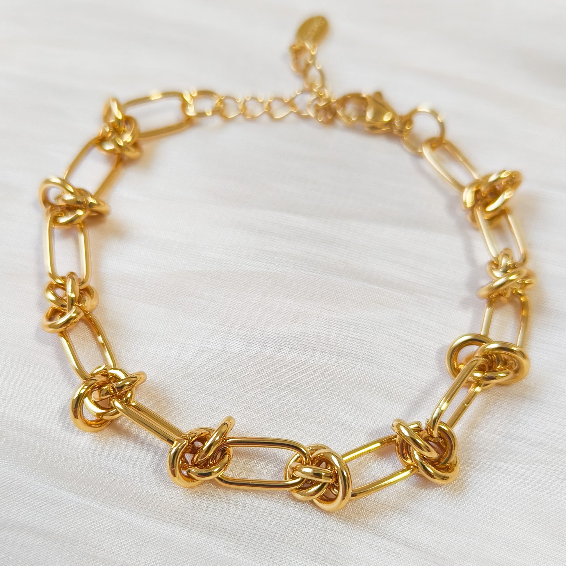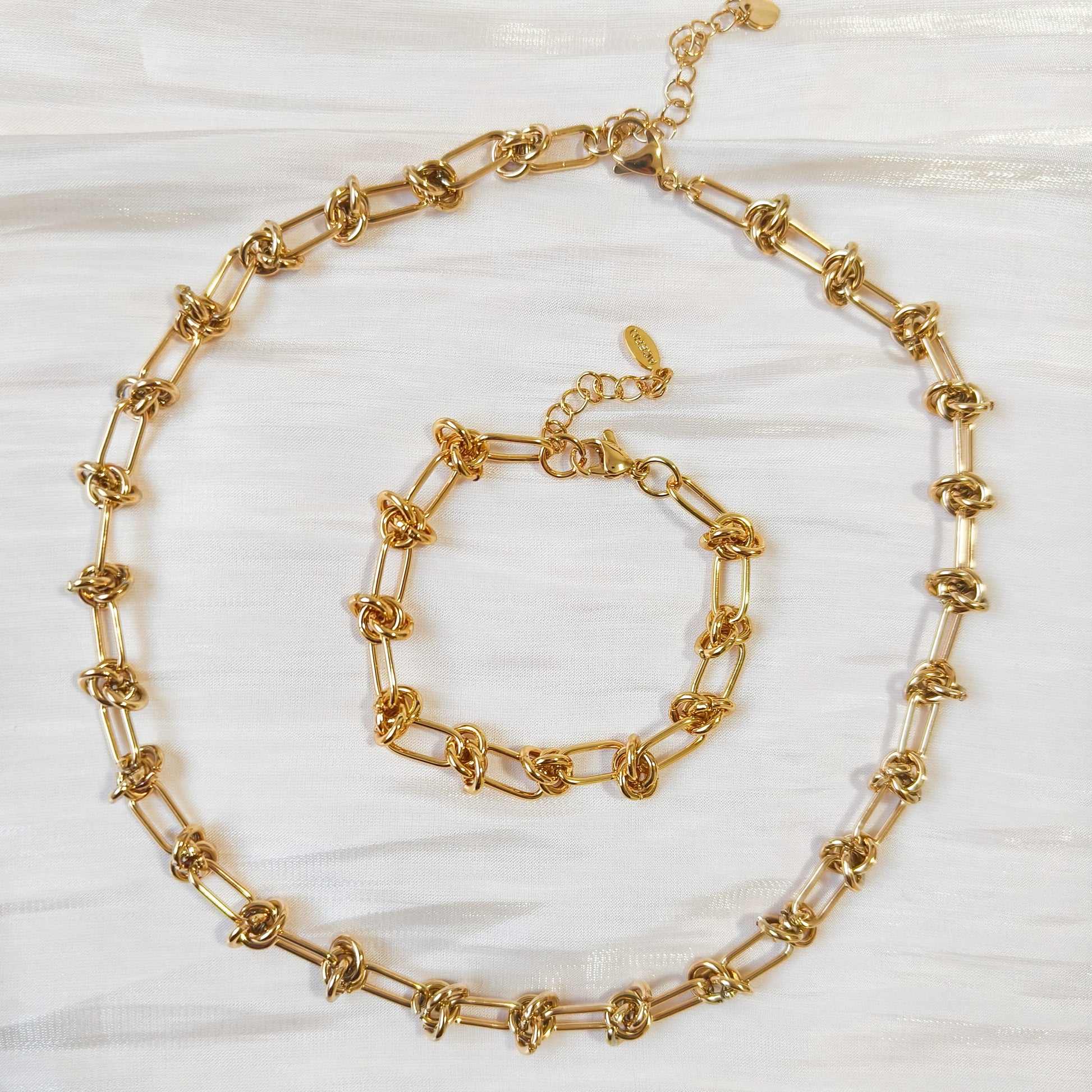 - Collar y pulsera de eslabones alargados con pequeños nudos dorados que crean un diseño moderno y delicado.