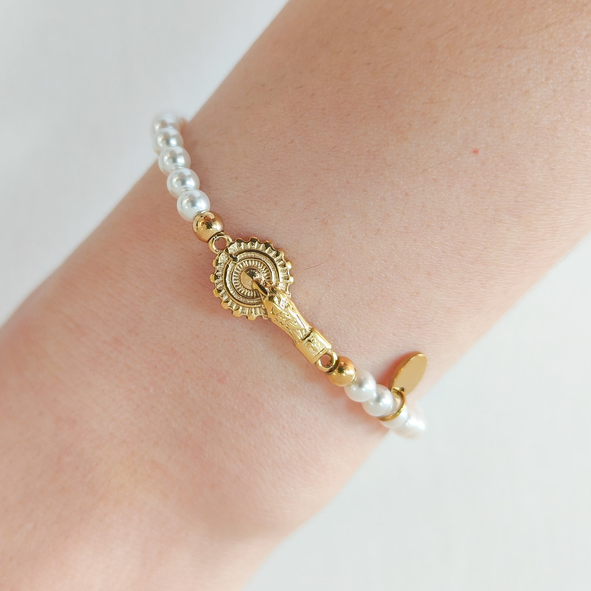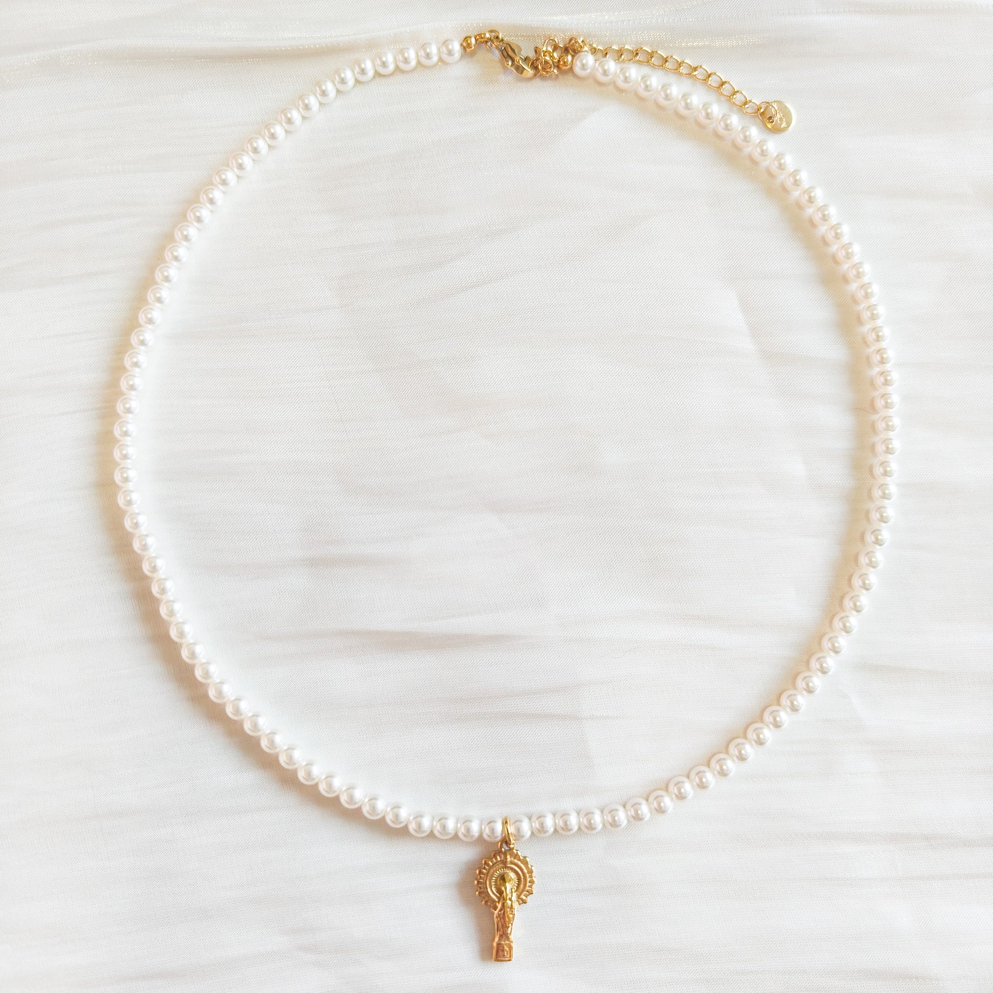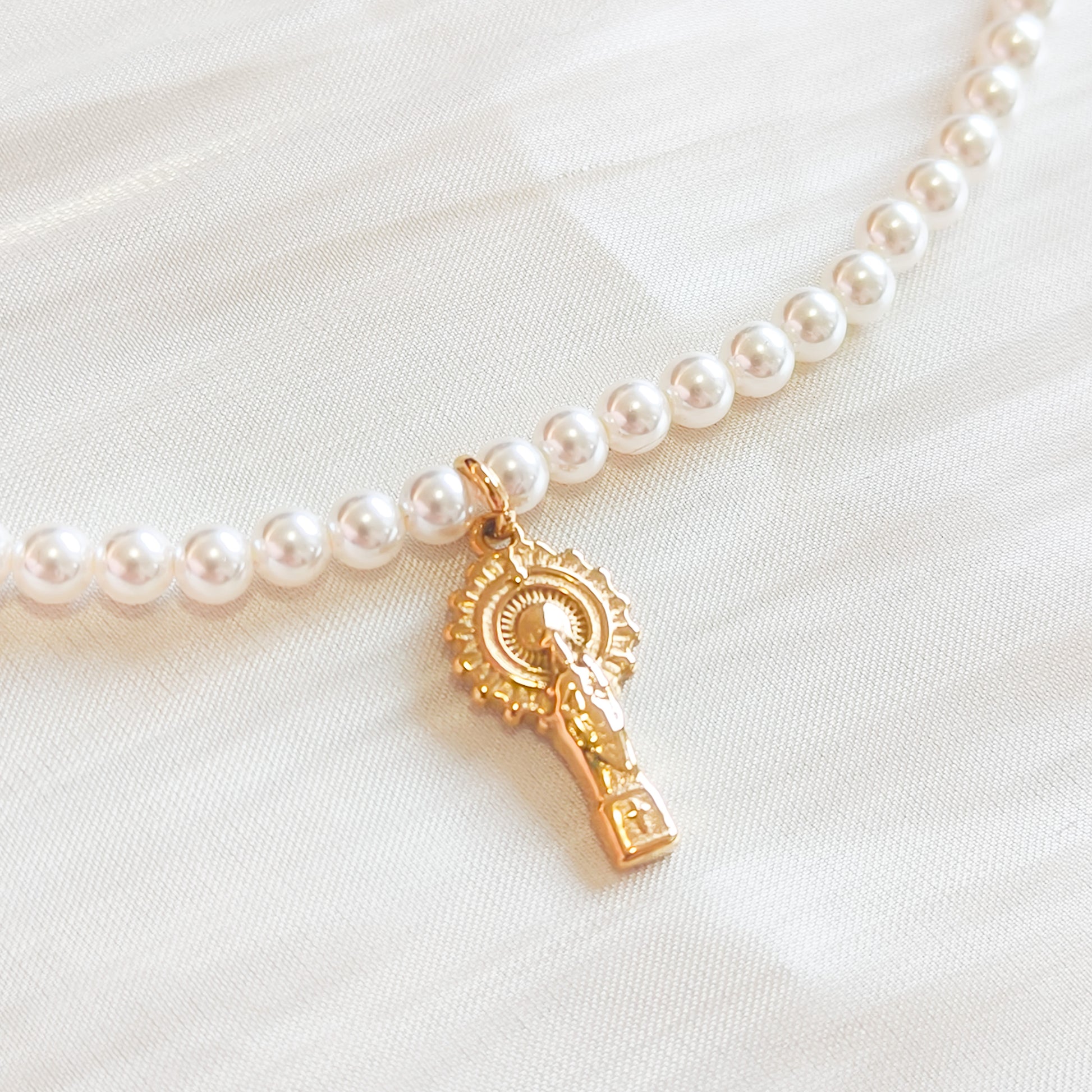 Collar corto y pulsera de perlas sintéticas blancas con pequeño colgante dorado de figura religiosa de Pilar.