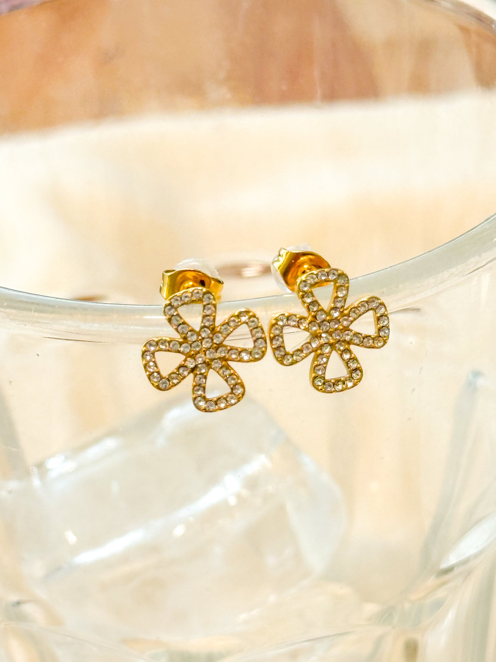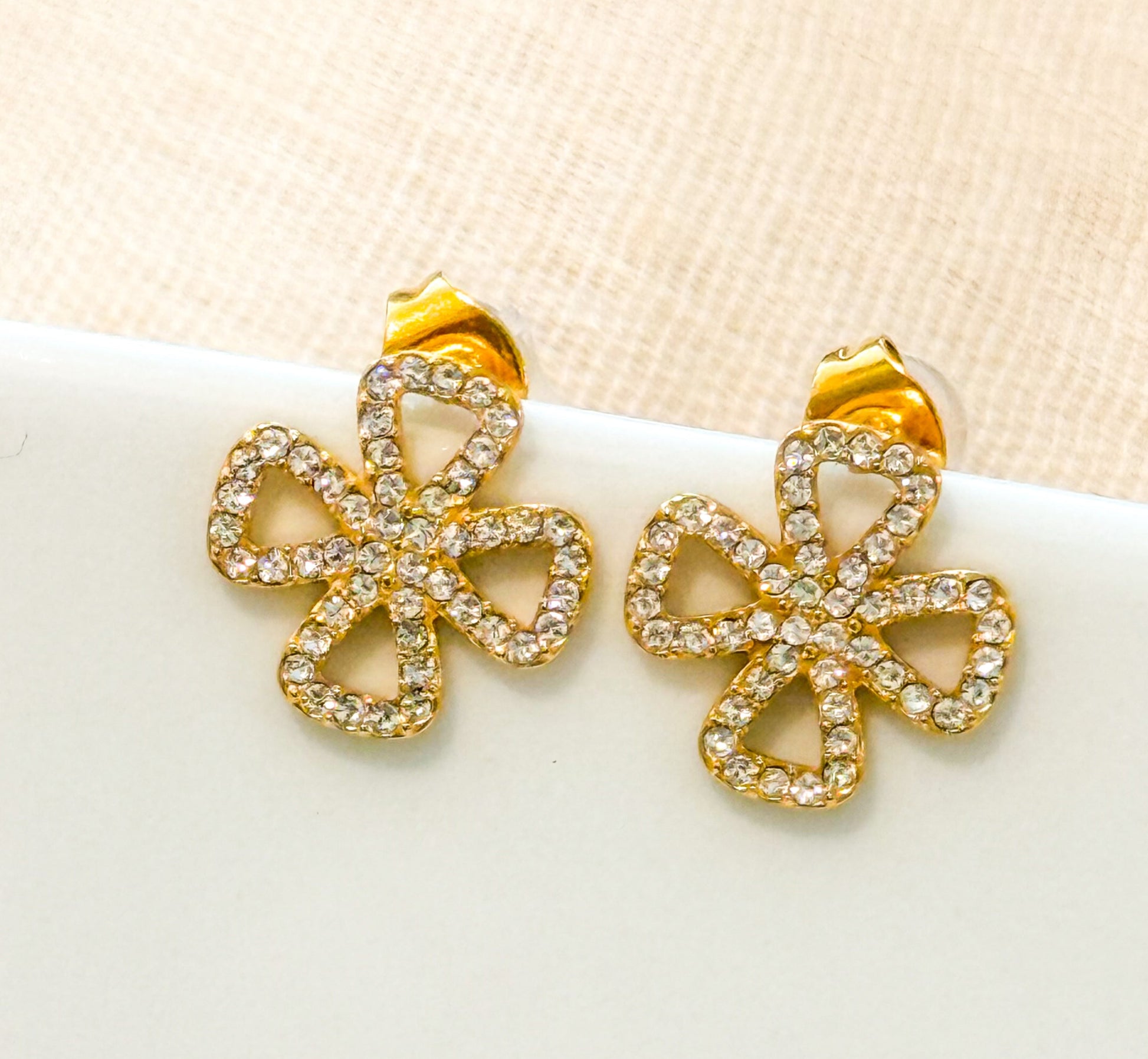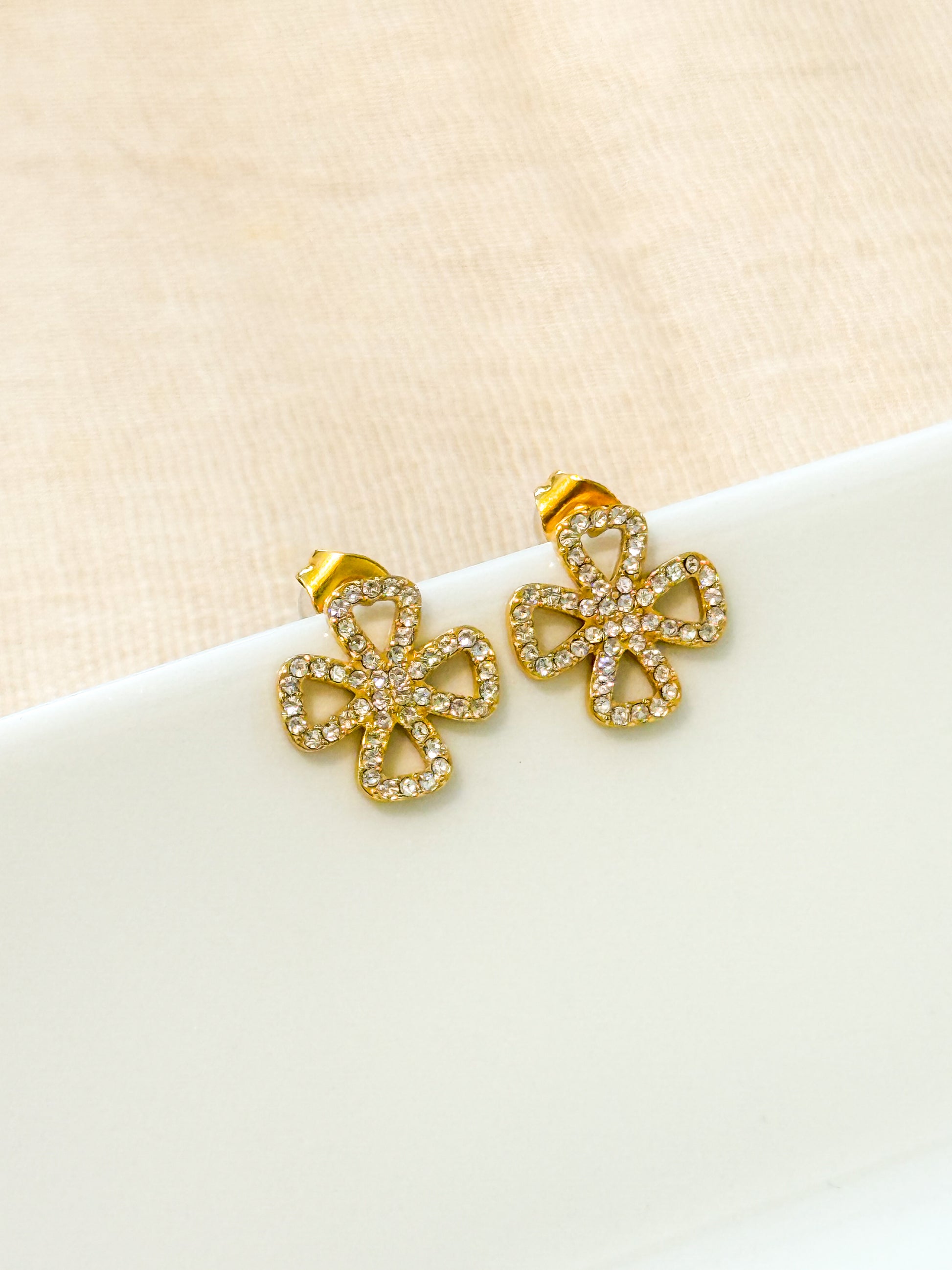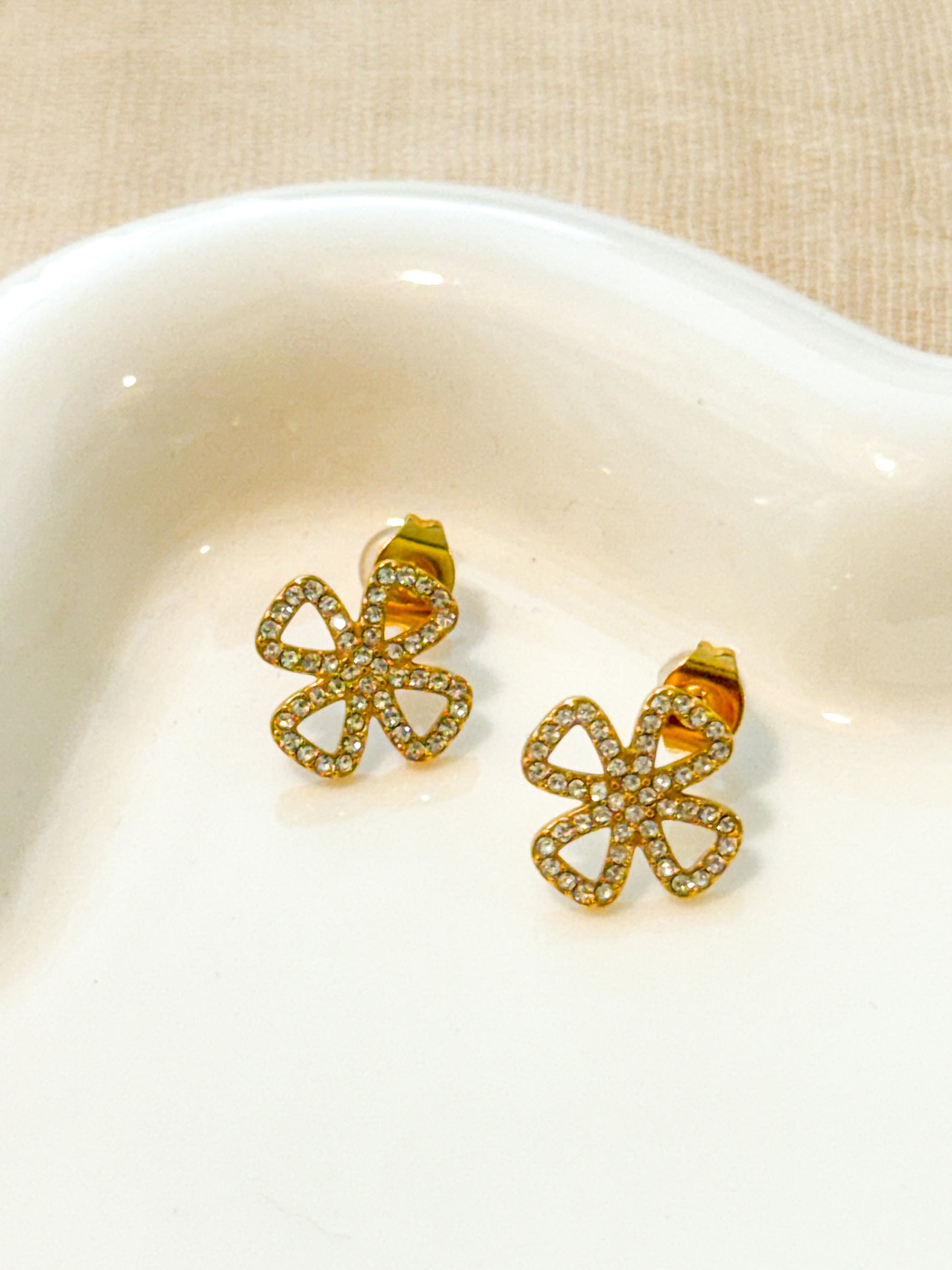 Pendiente trébol lleno de brillo, pequeño y delicado.