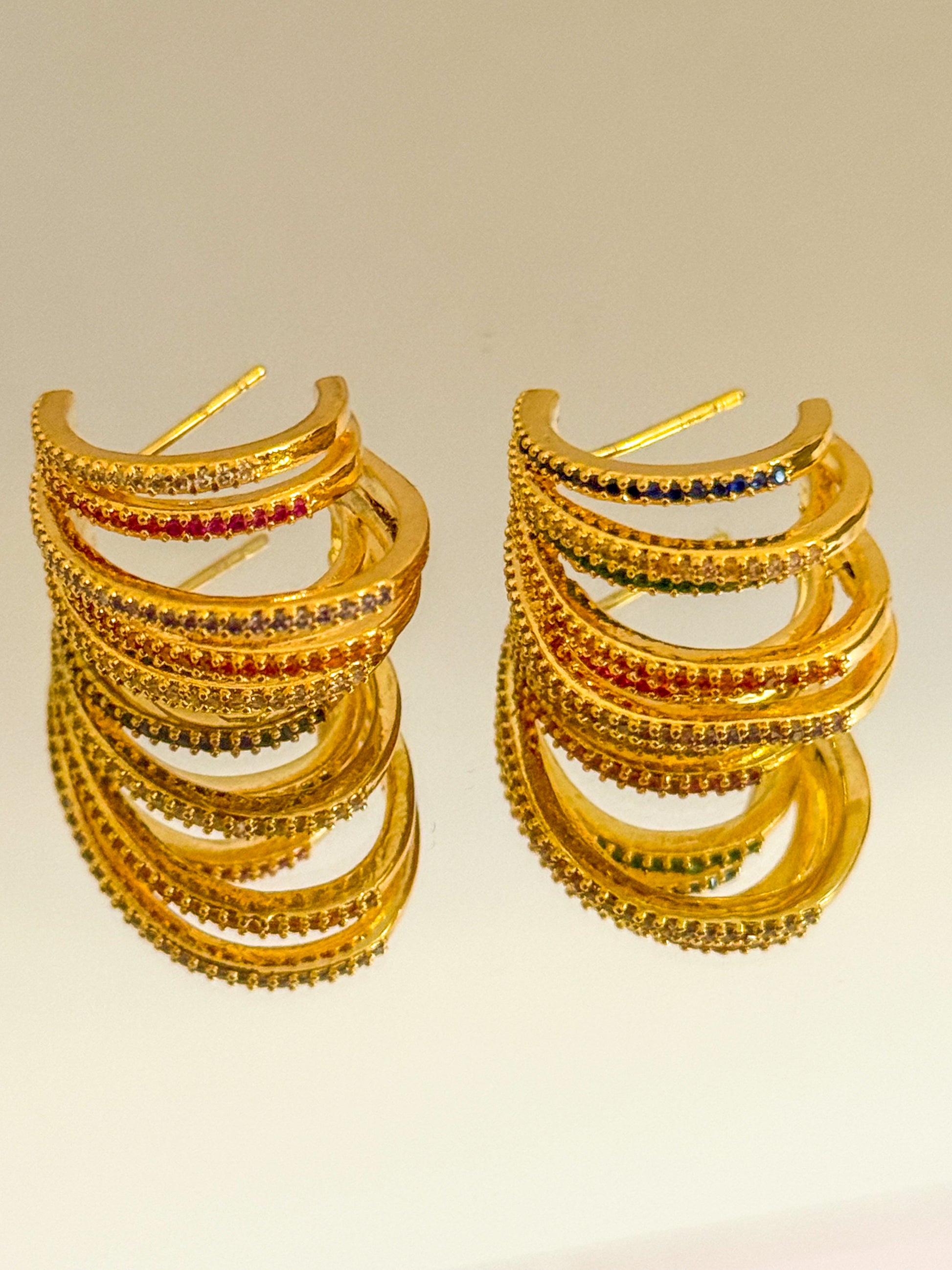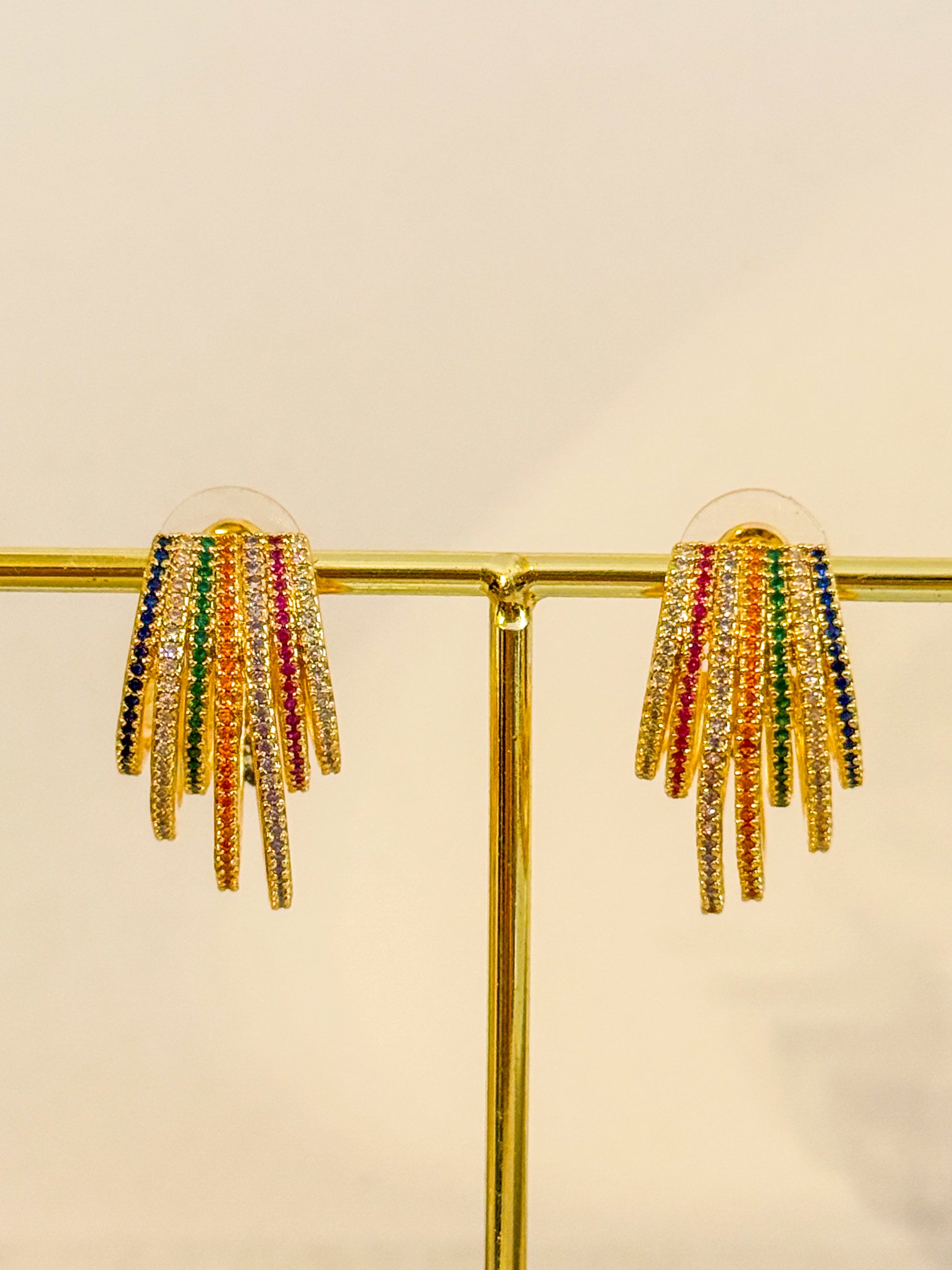 Un diseño lleno de movimiento y luz. Estos pendientes dorados con pequeñas piedras multicolor reflejan la alegría de los días soleados y la energía positiva de la moda femenina moderna. Una joya elegante que ilumina el rostro con cada gesto.