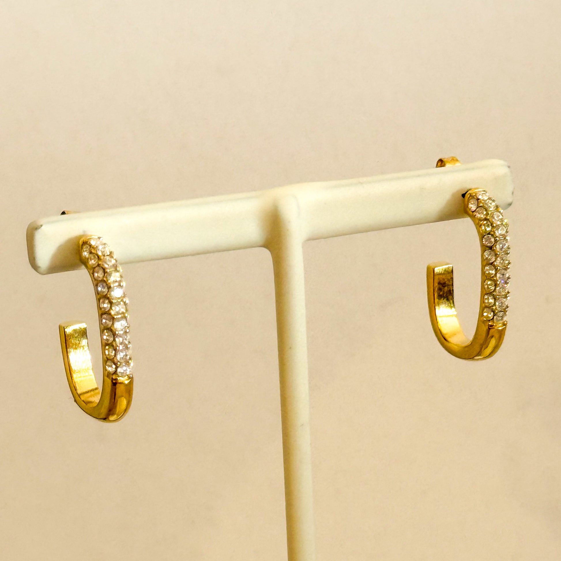 Pendientes dorados de medio aro con detalles luminosos. Una pieza sofisticada que combina fuerza y elegancia.