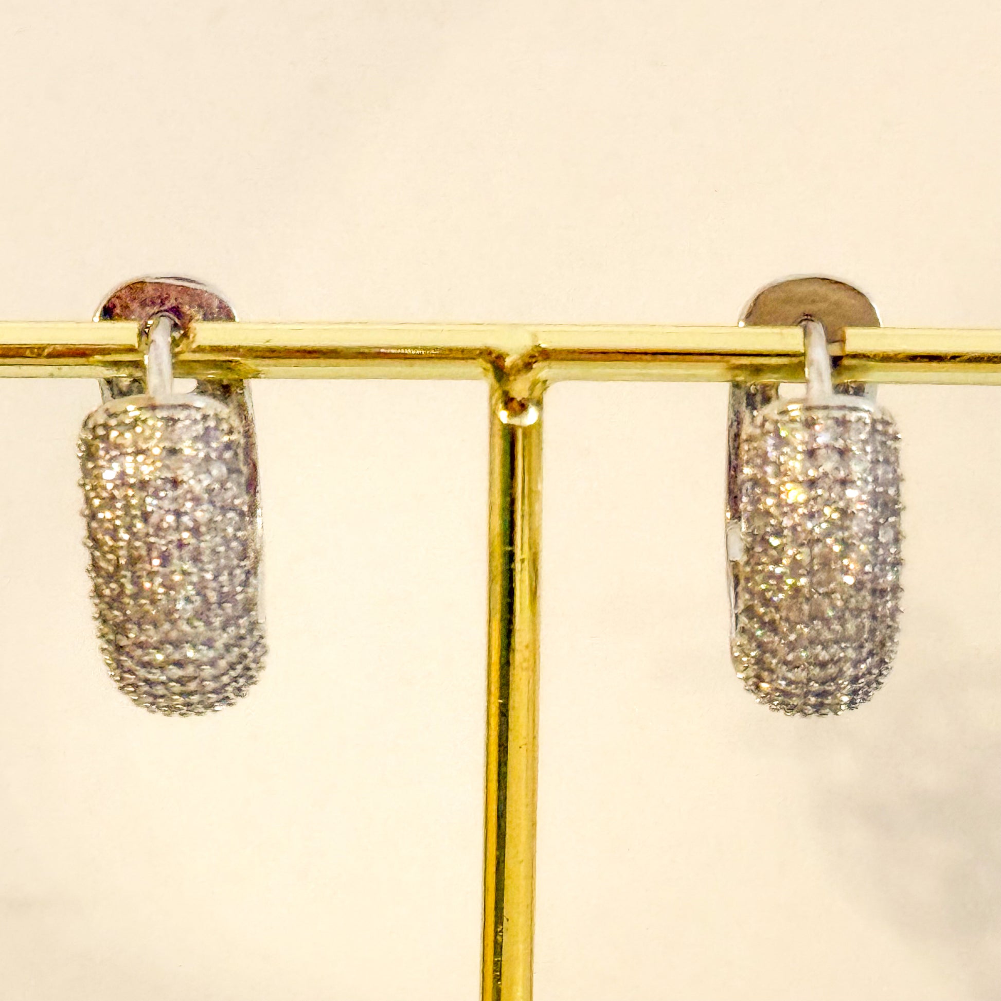 Estos aros pequeños, cubiertos de destellos, son como gotas de luz sobre la piel.