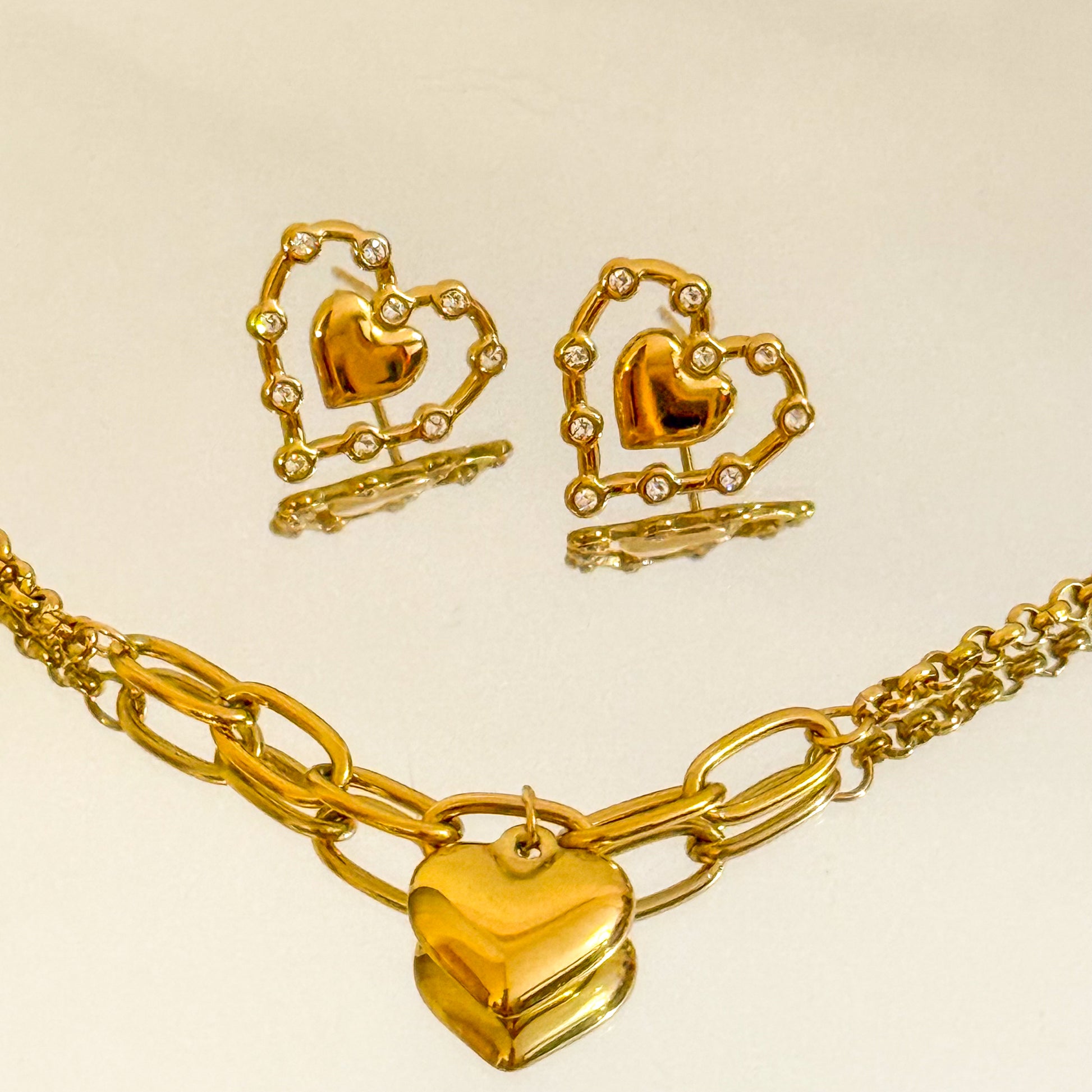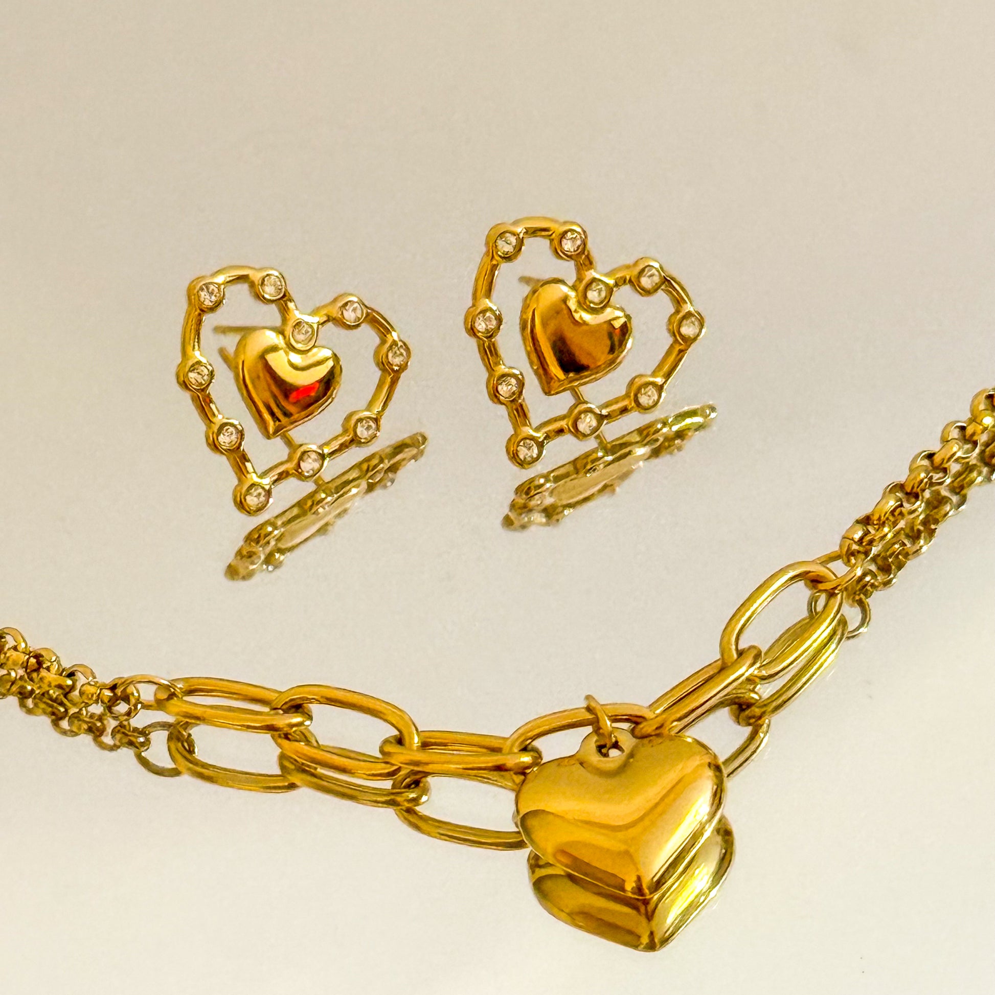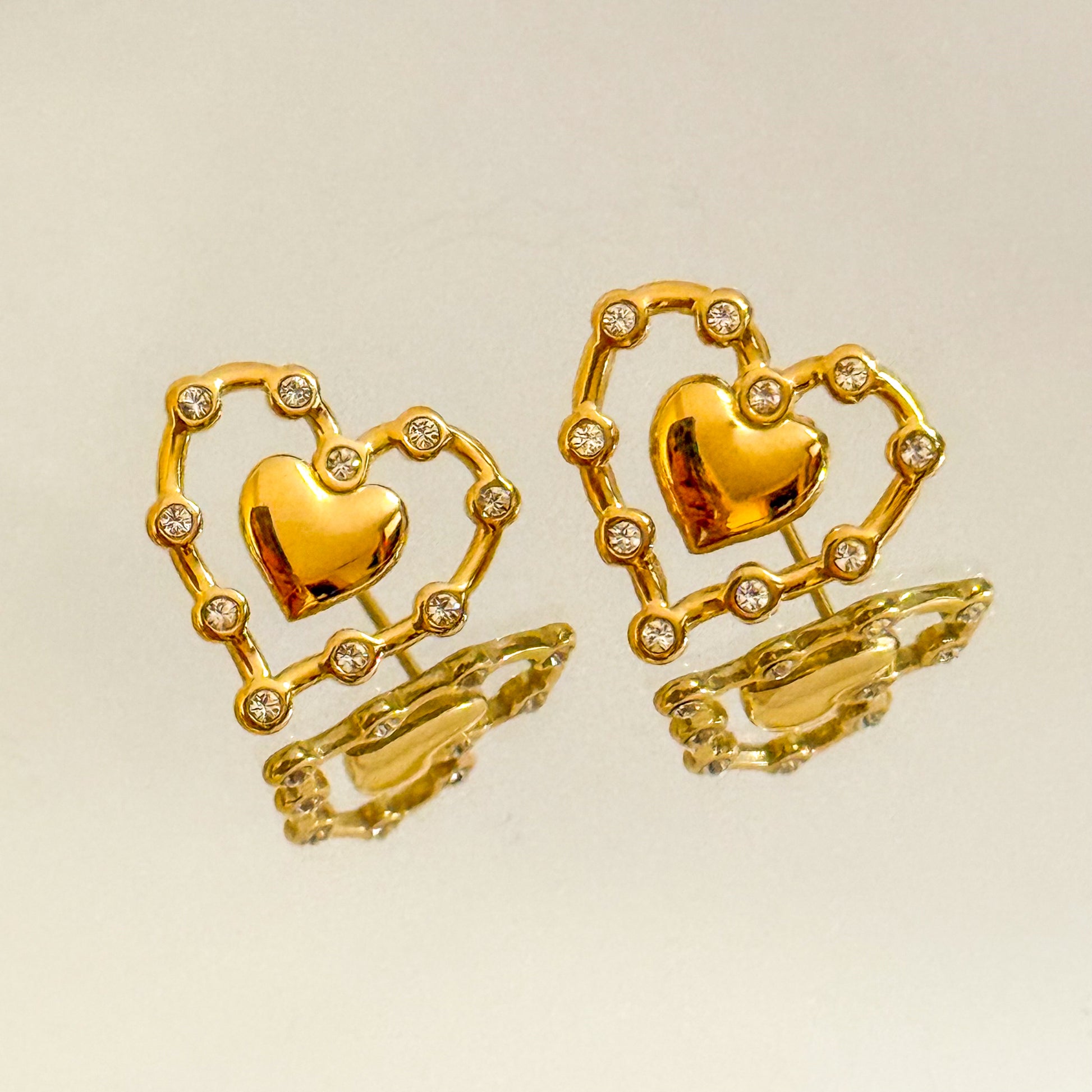 Un corazón dorado enmarcado por circonitas brillantes que crean un halo delicado y femenino.