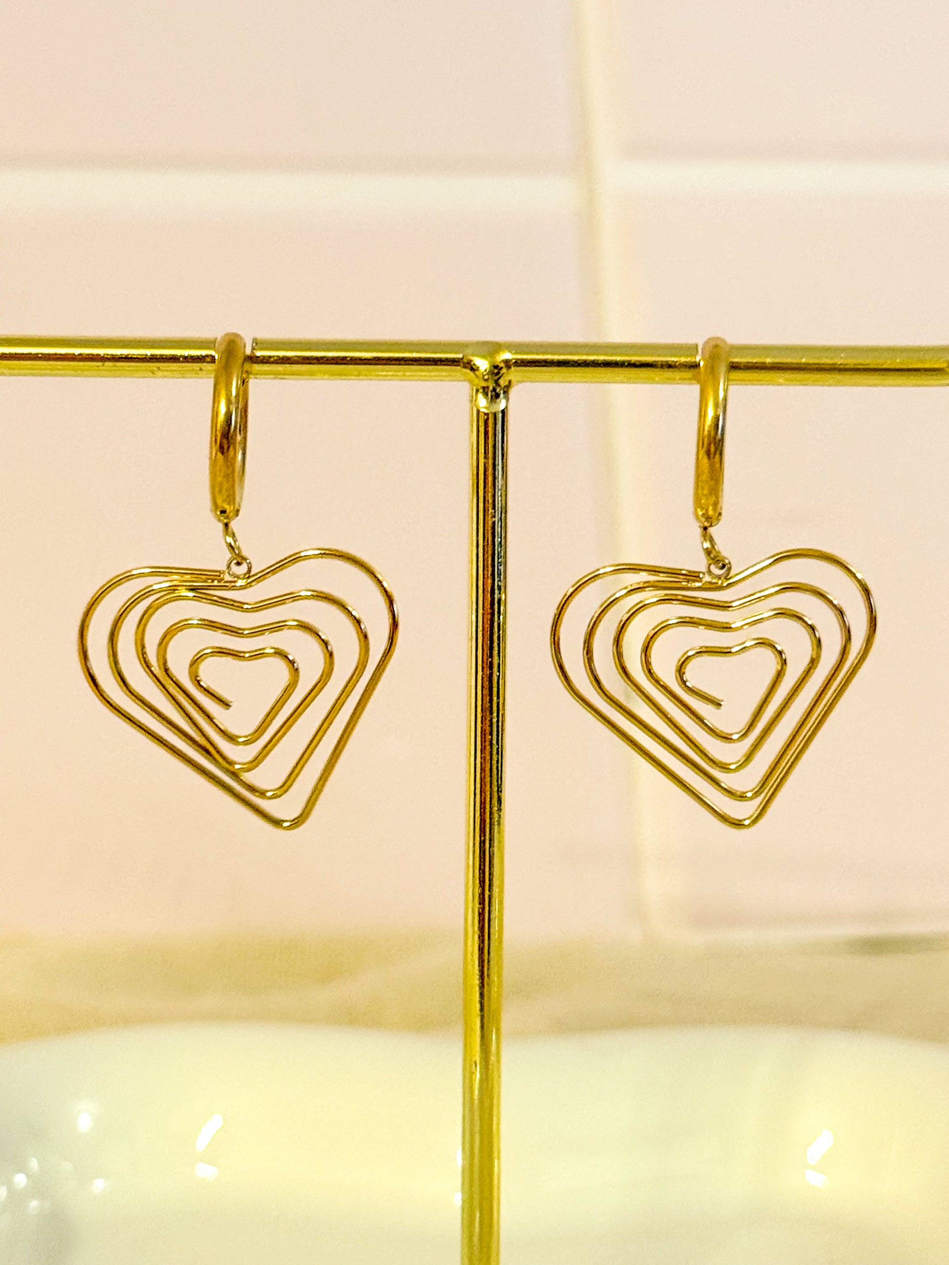 Pendientes con diseño de corazones en capas, inspirados en la forma de un clip moderno. Hechos en acero inoxidable, resistentes y ligeros.