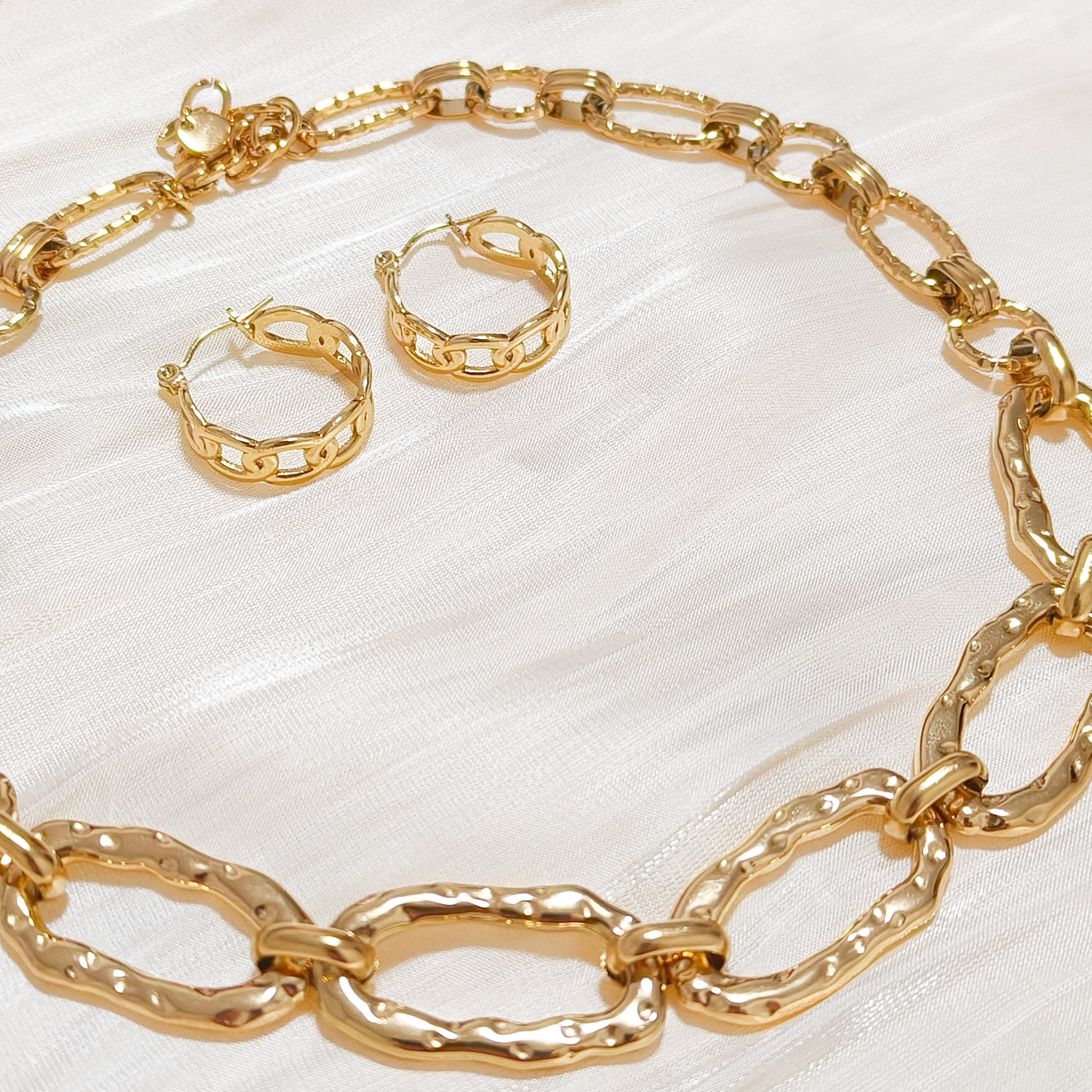 - Pendientes tipo aro formados por pequeños eslabones dorados unidos, modernos y súper elegantes.