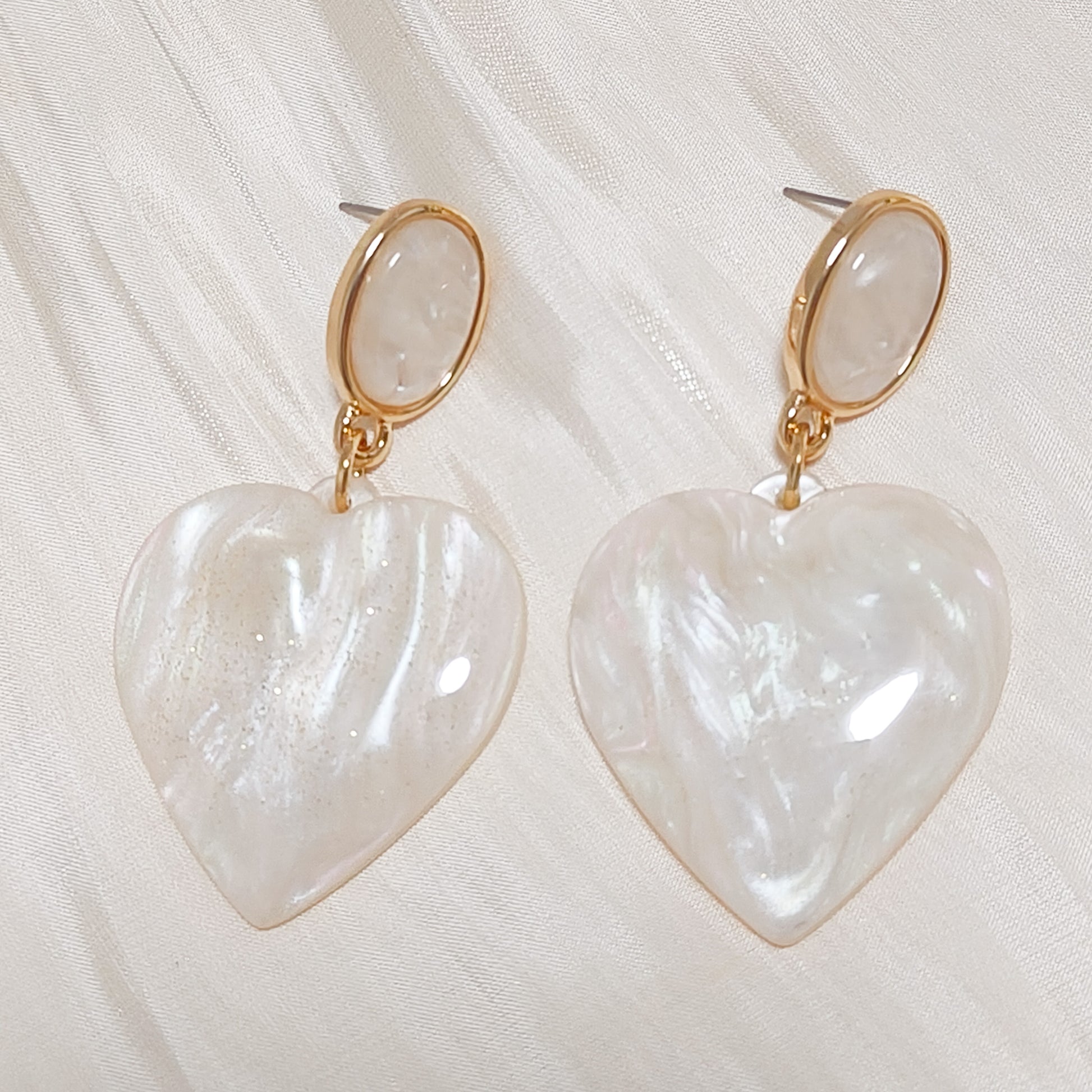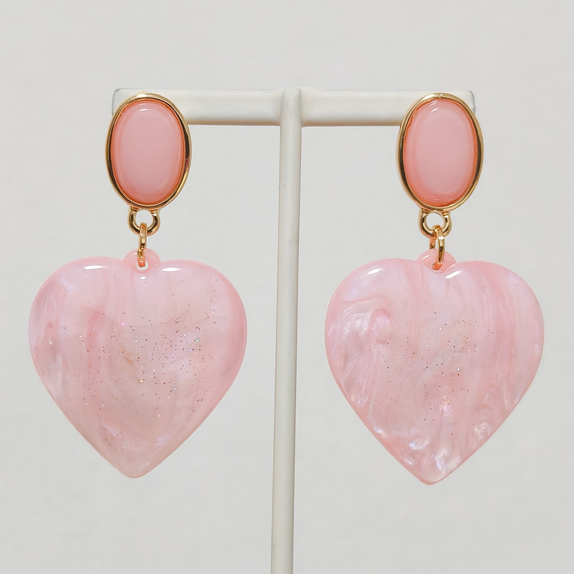 Pendientes tipo botón con un gran corazón colgante en tono rosado nacarado, suaves y románticos. Tienen un brillo delicado que recuerda a los cielos de atardecer. Dan un aire dulce, femenino y muy favorecedor al rostro.