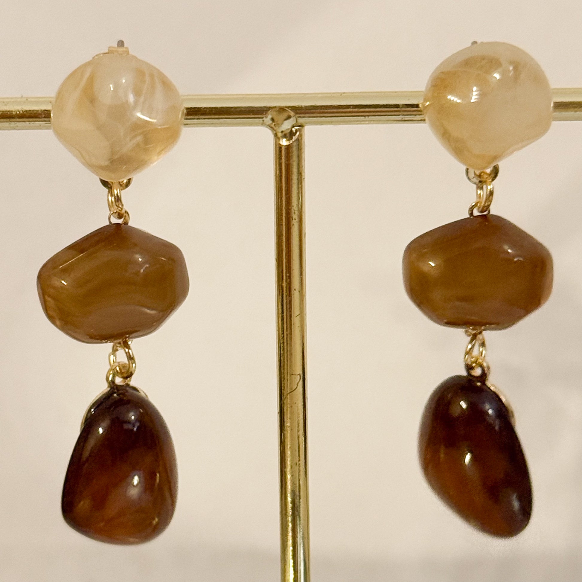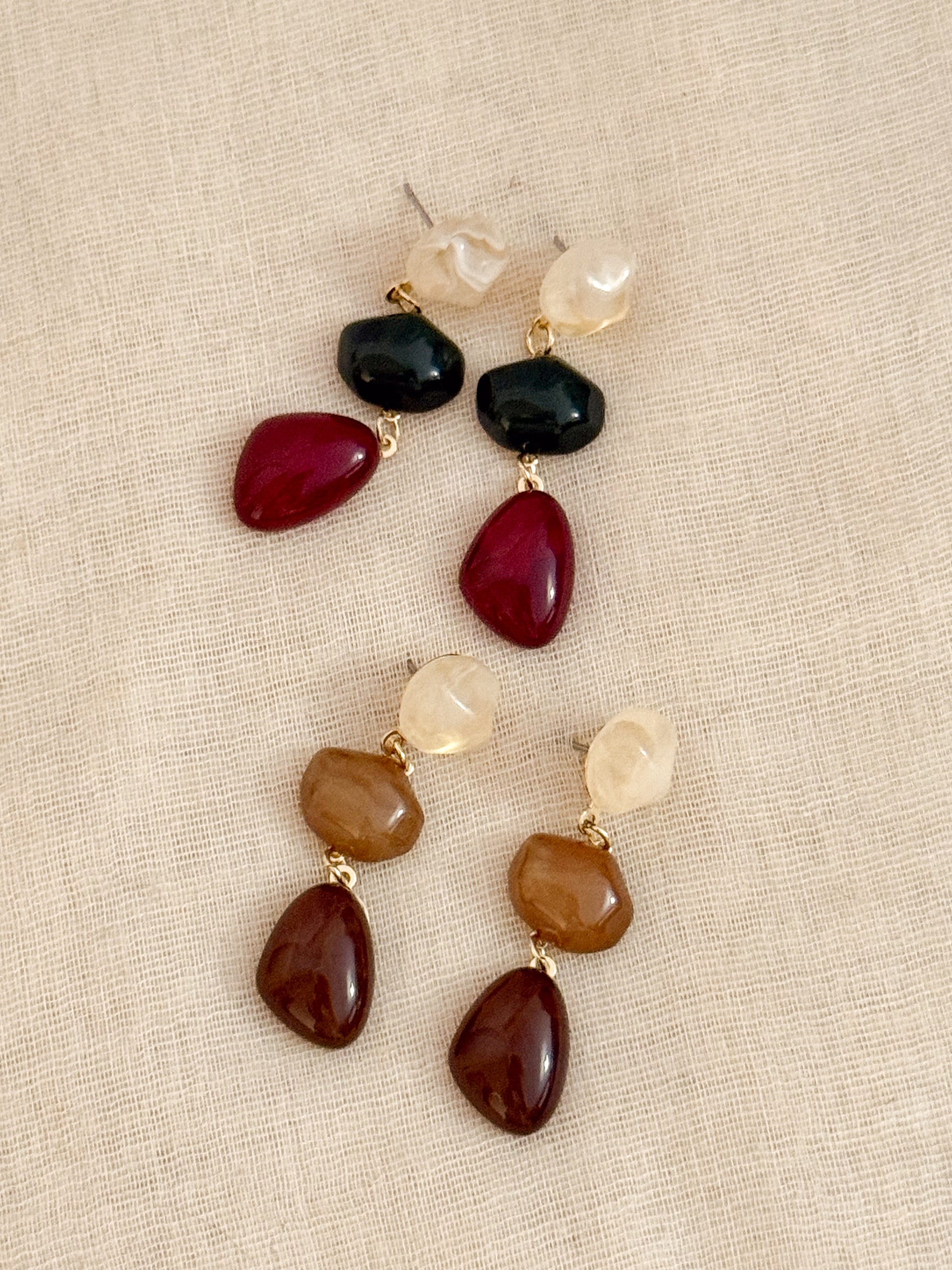 Pendientes largos con tres piezas efecto piedra pulida que caen con un movimiento elegante y natural. Sus colores tierra y vino aportan calidez, armonía y un toque sofisticado.