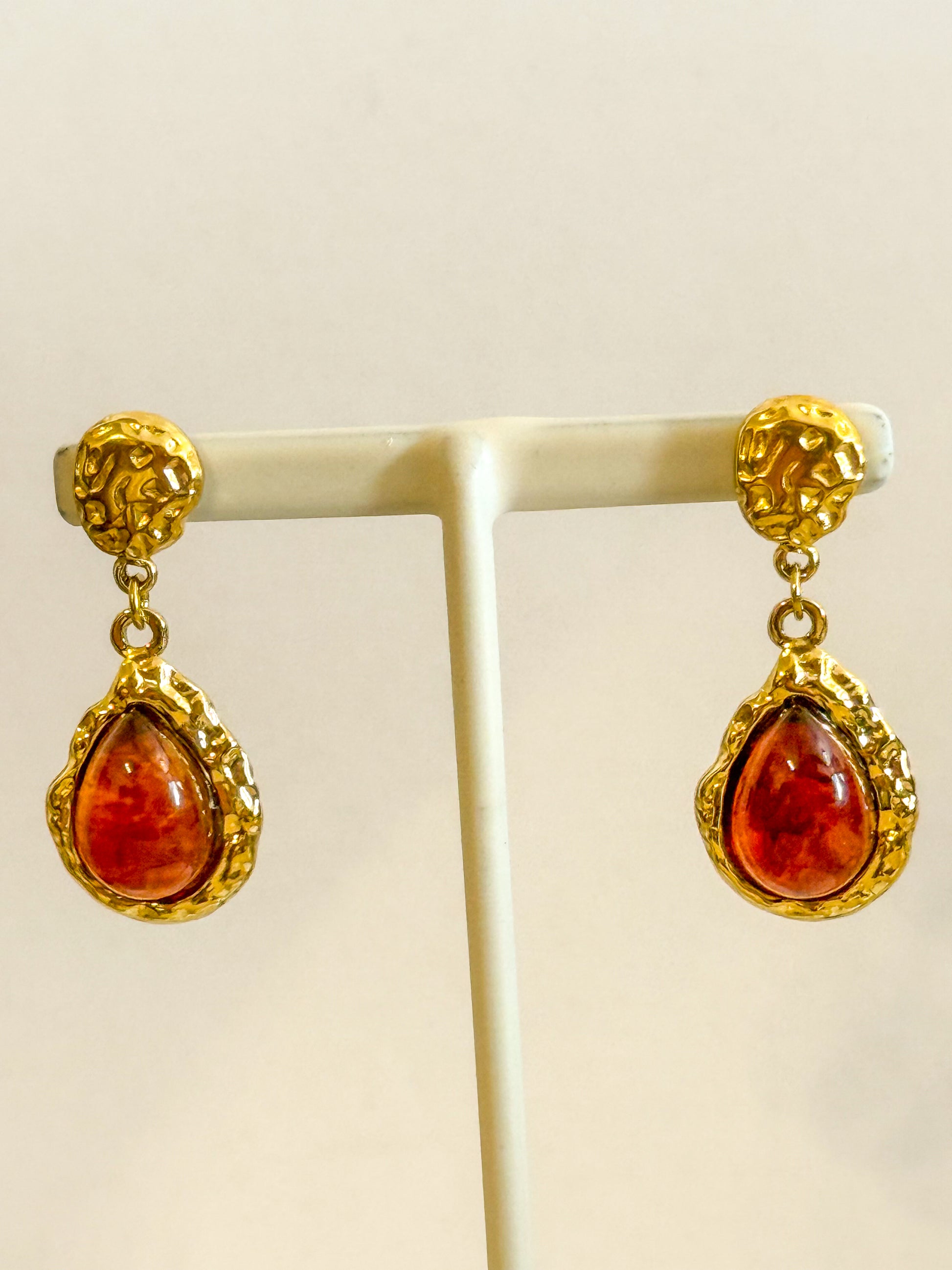 Descripción: Inspirados en la luz del atardecer, estos pendientes en forma de gota con tono ámbar añaden calidez y elegancia.