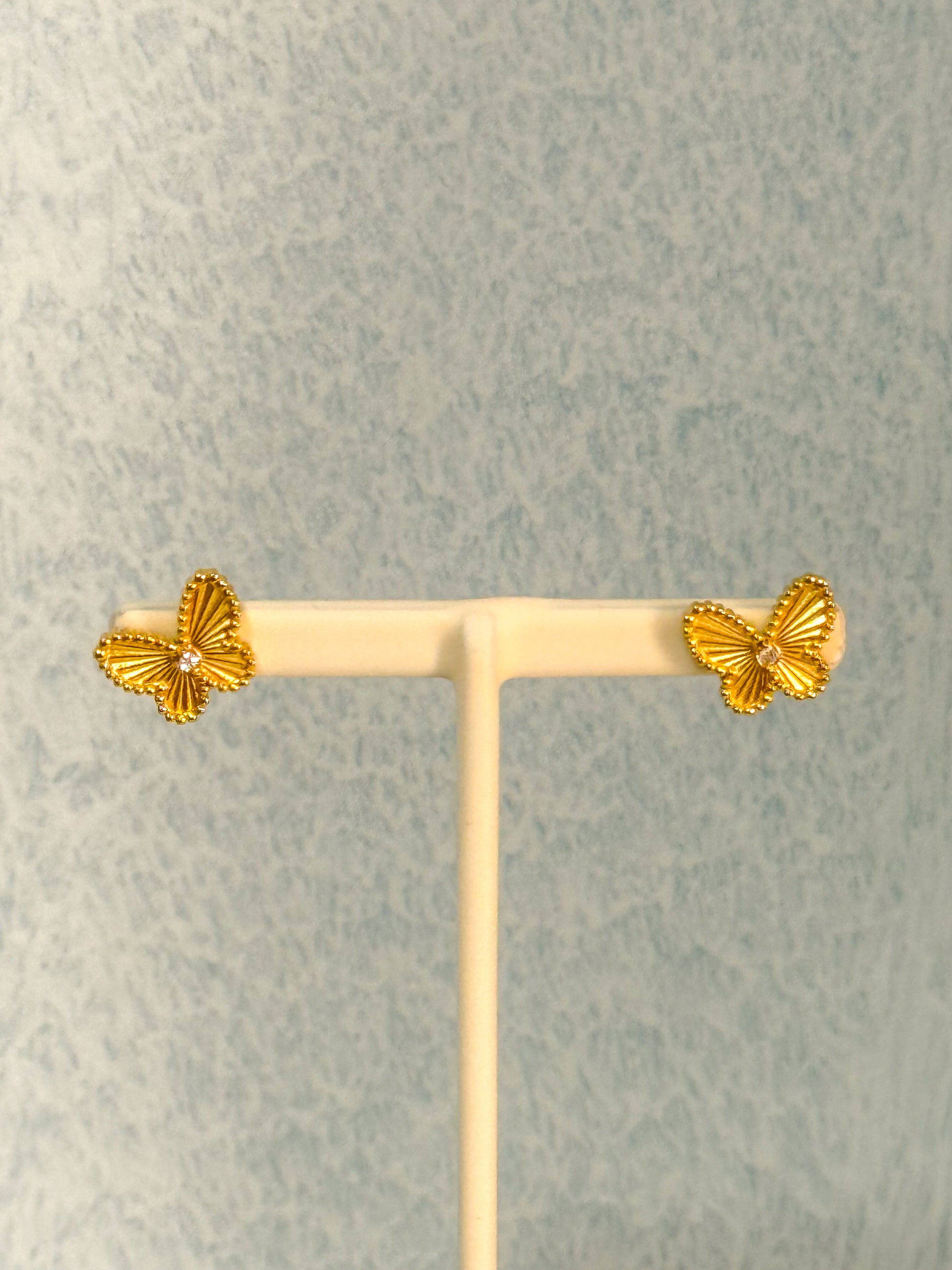Pendientes con forma de mariposa elaborados en acero inoxidable, con detalles en relieve y un toque brillante en el centro. Ligeros y cómodos, transmiten alegría y movimiento.