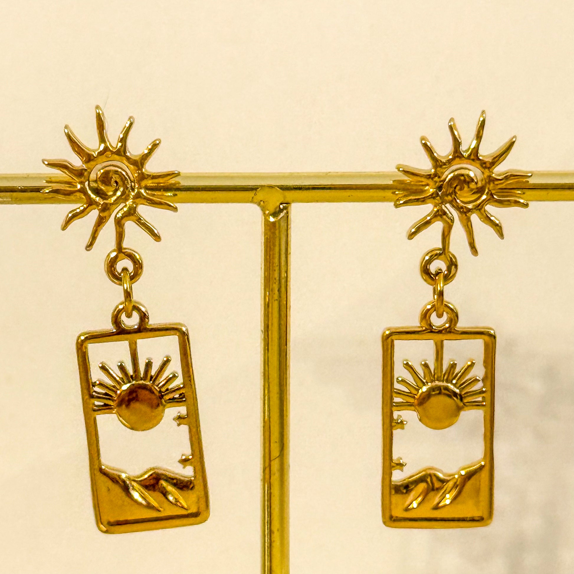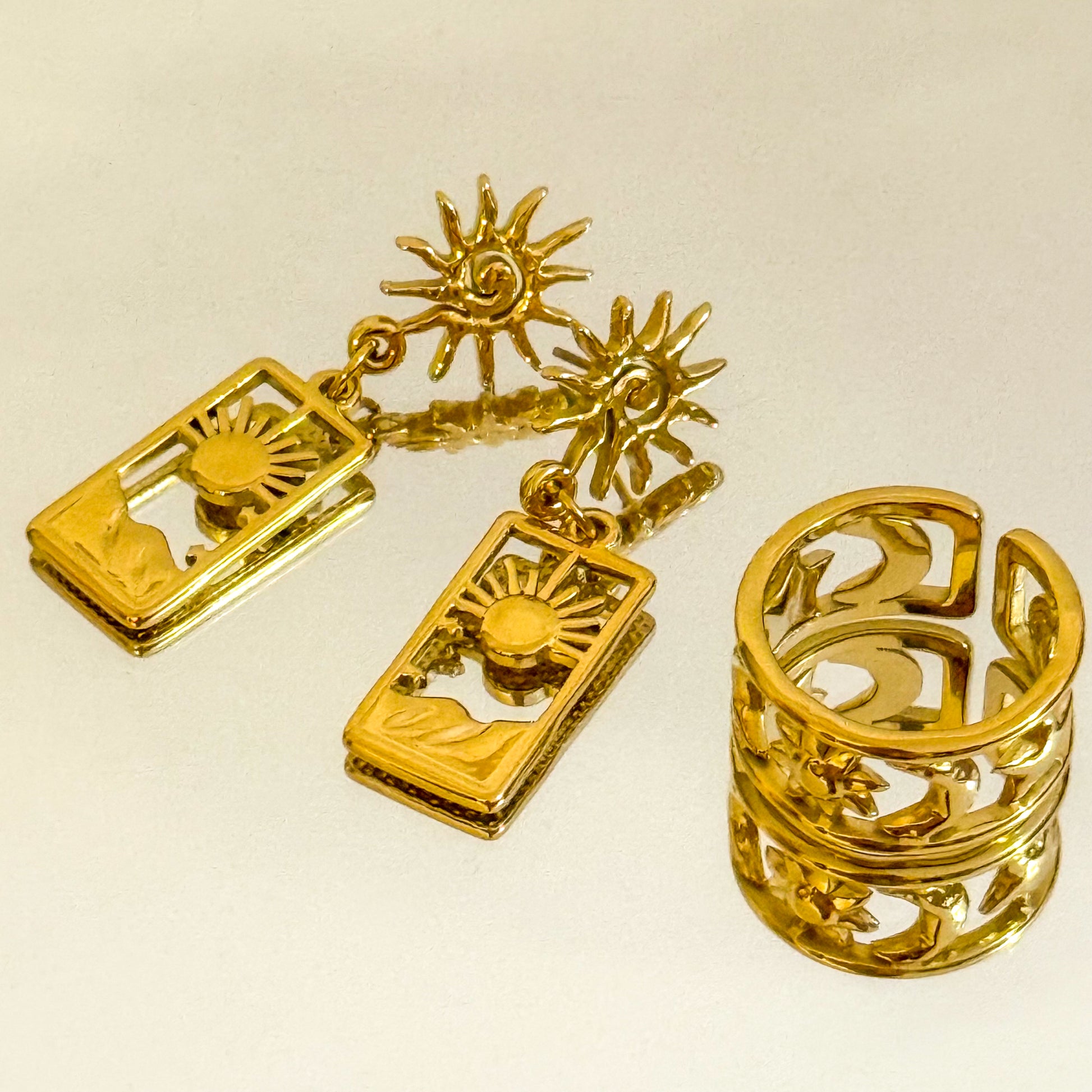 El diseño calado crea profundidad y movimiento, mientras el sol dorado central aporta una sensación cálida y espiritual.