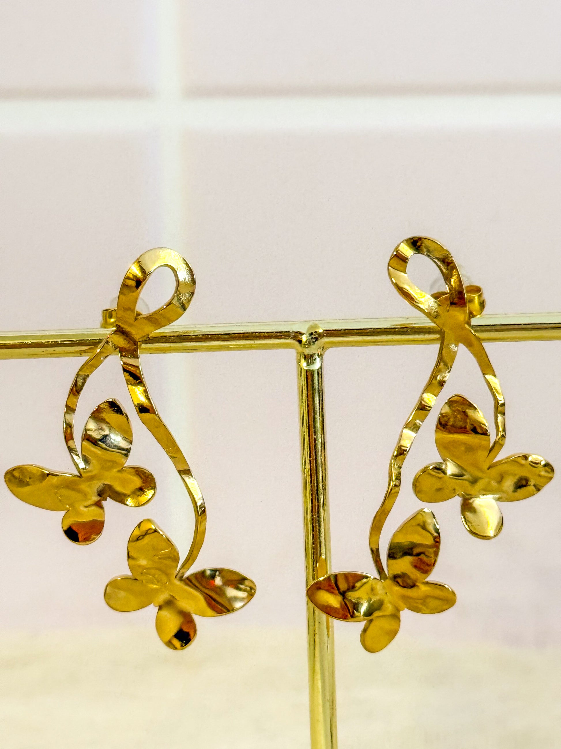 Descripción: Pendientes largos con tres mariposas doradas, diseño ligero y elegante que ilumina el rostro.