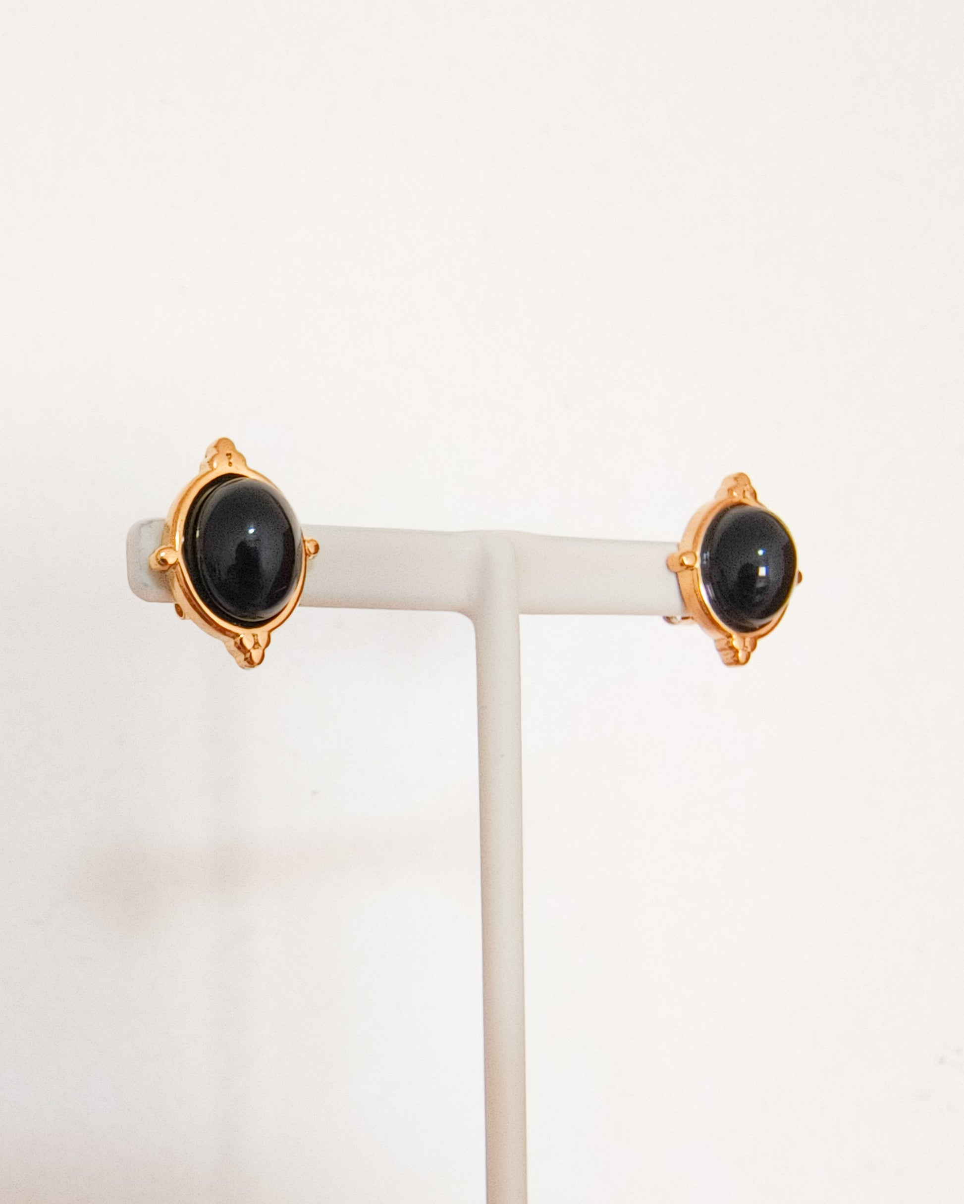 Pendientes pegados y elegantes con efecto piedra central negra rodeada de marco dorado de acero inoxidable. Discretos pero sofisticados, perfectos para uso diario.