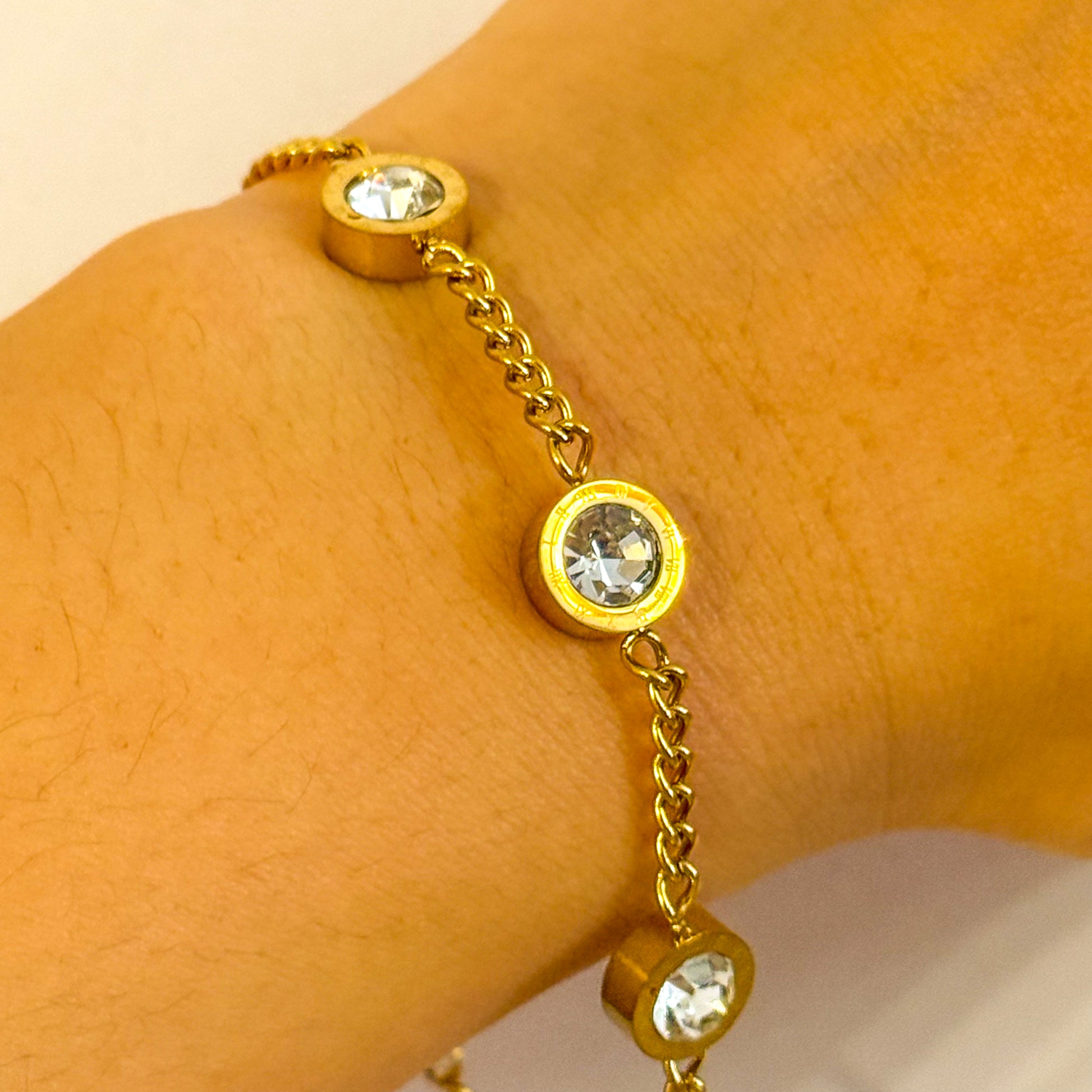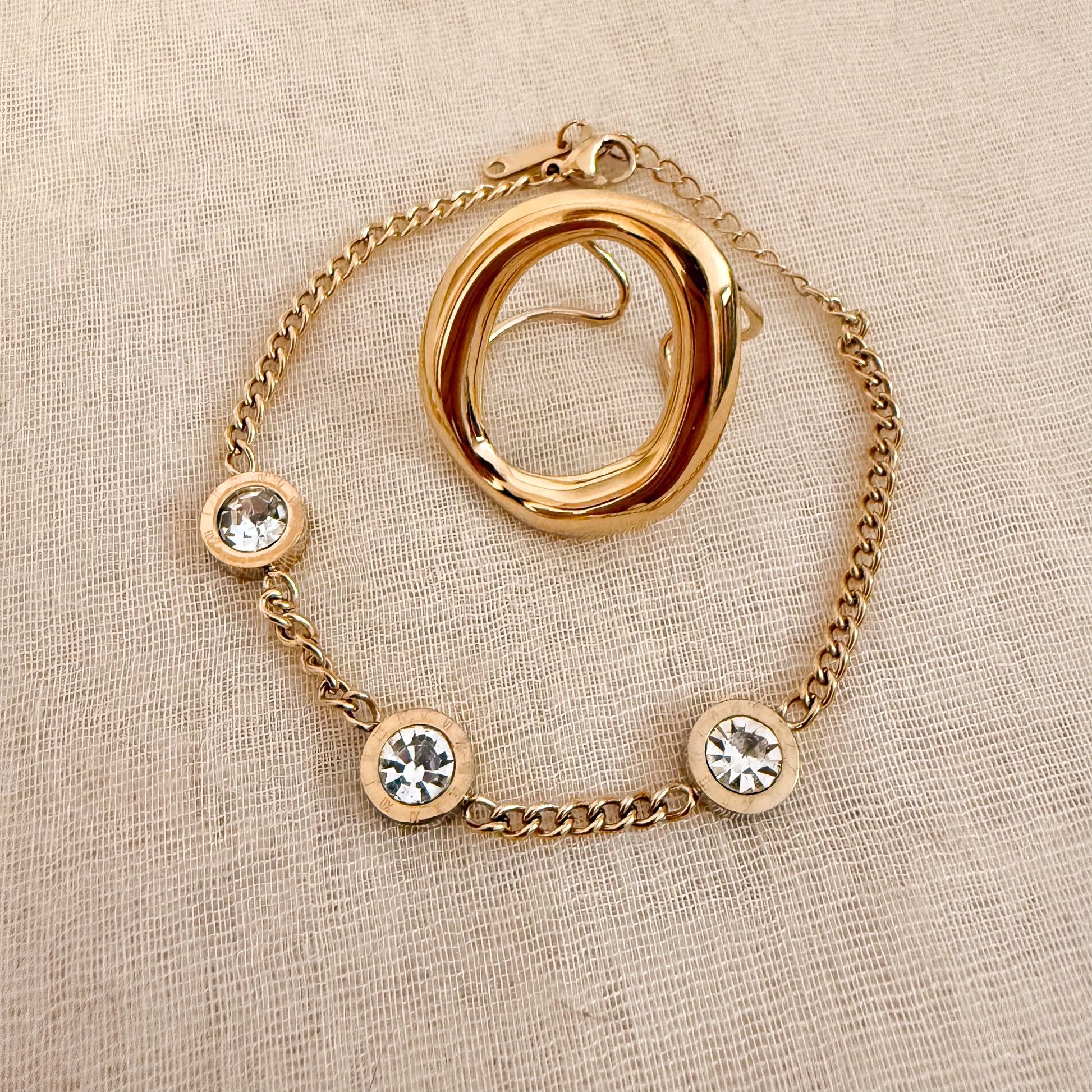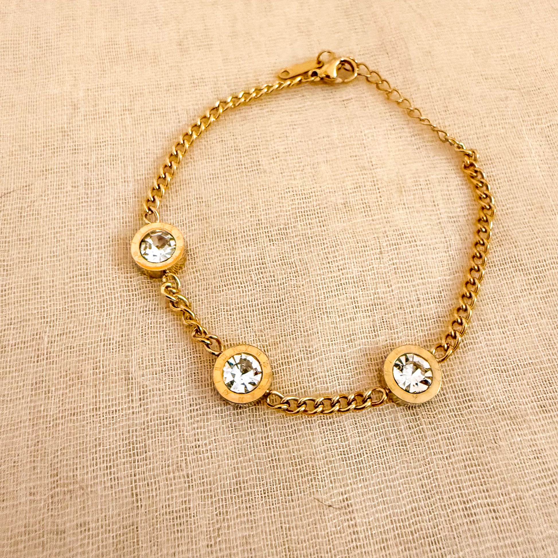 Una pulsera dorada con tres puntos de luz que destacan por su brillo limpio y elegante.
