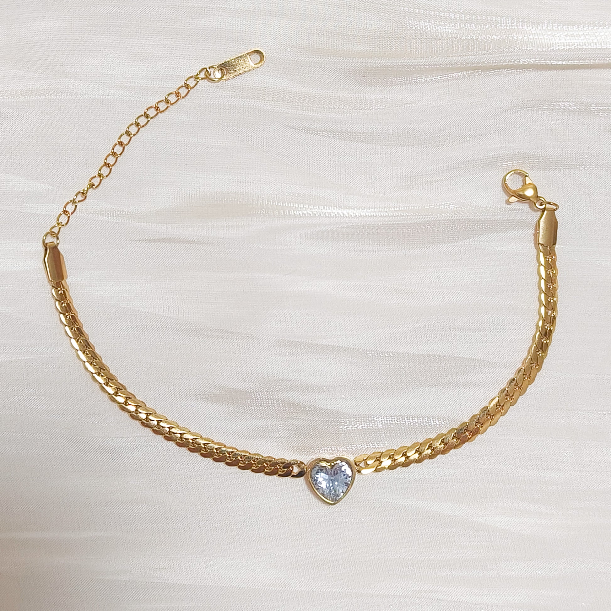 - Pulsera dorada, semirrígida, de cadena fino con un corazón central azul claro de cristal de fantasía, delicado y súper brillante.