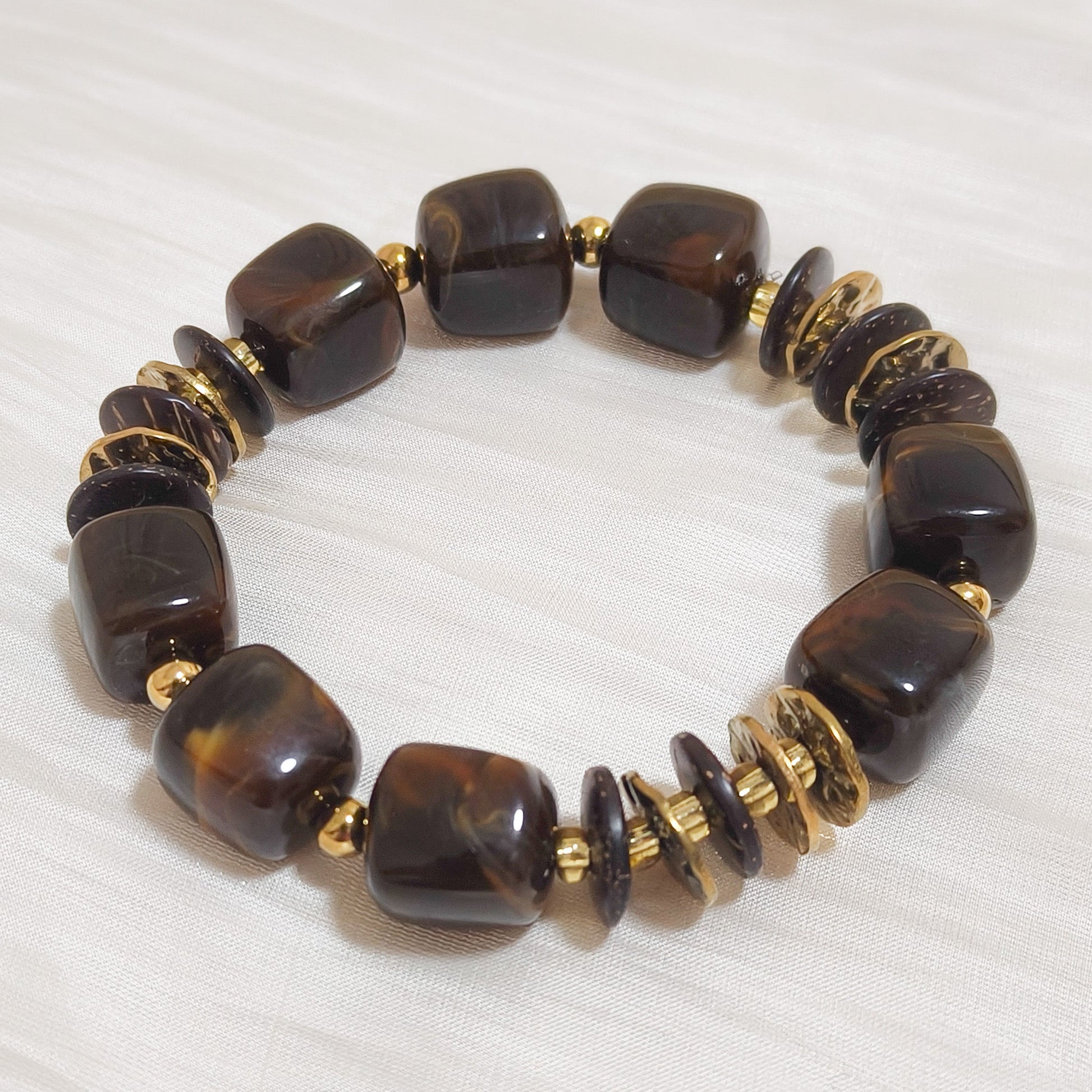 - Pulsera elástica con cuentas marrones efecto piedra y separadores dorados que le dan un aire elegante y boho.