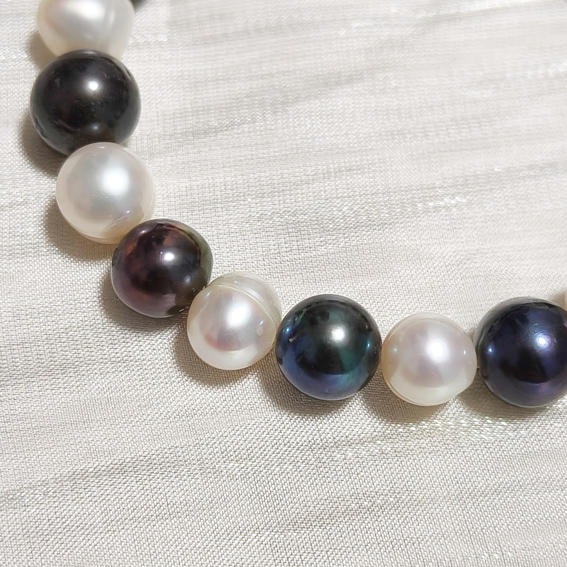 Cuenta con perlas agua dulce en dos tonos. ( las cuentas oscuras de cada pulsera tienen diferentes tono de negro o gris)
