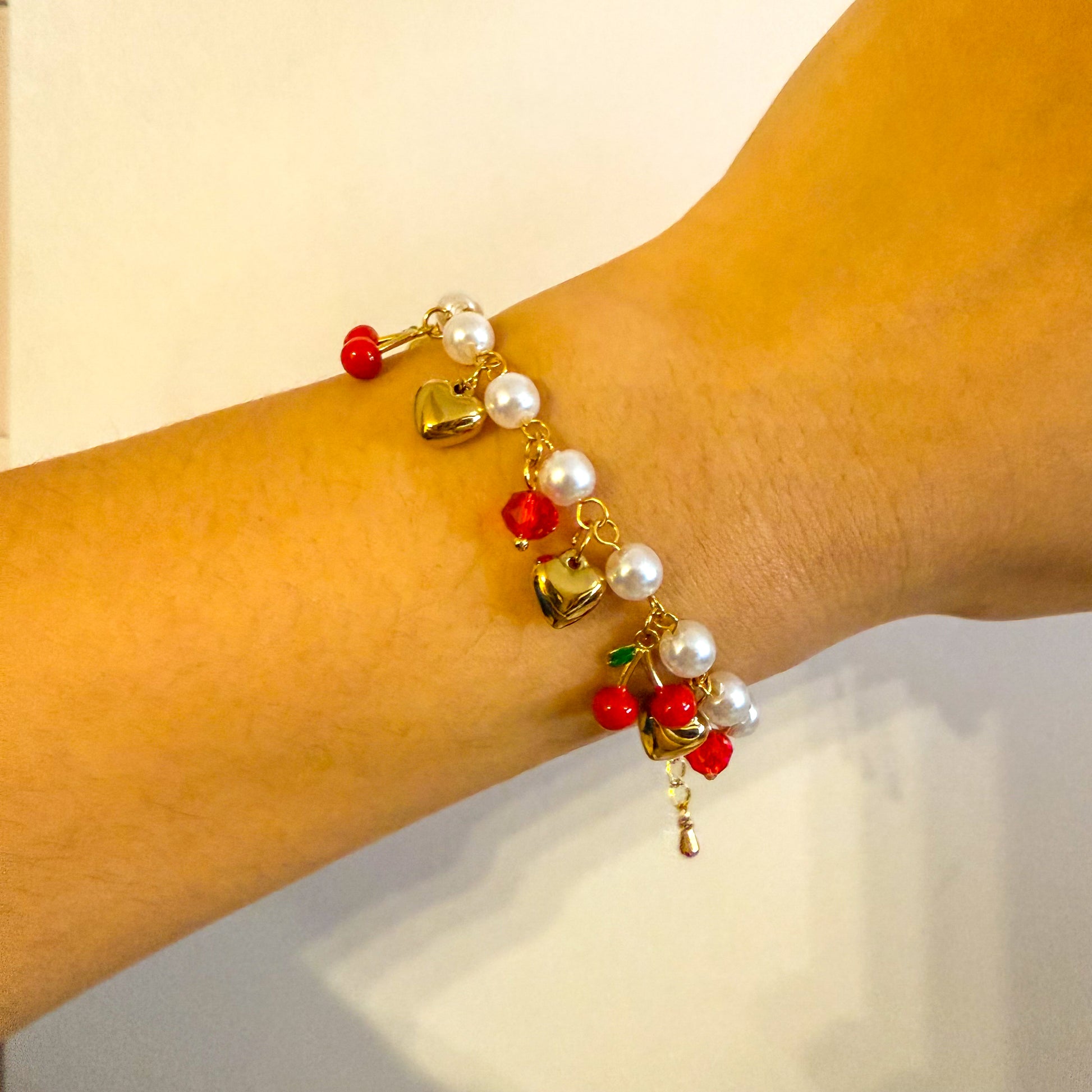 Un diseño encantador y lleno de alegría. Esta pulsera combina perlas blancas, pequeñas cerezas rojas y corazones dorados que aportan un toque dulce, juvenil y muy femenino.