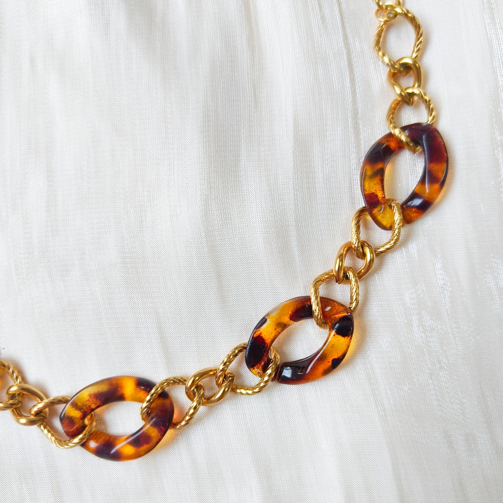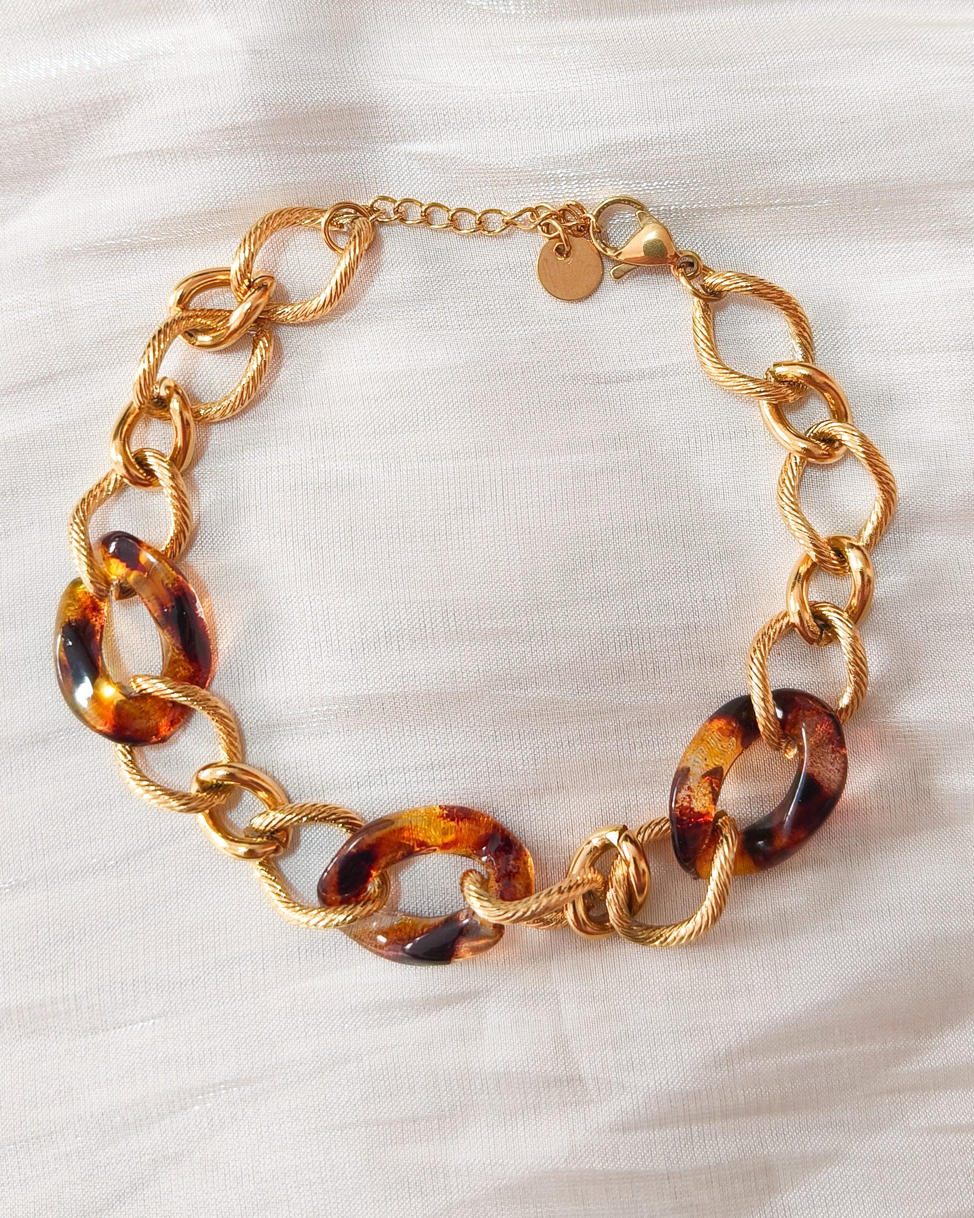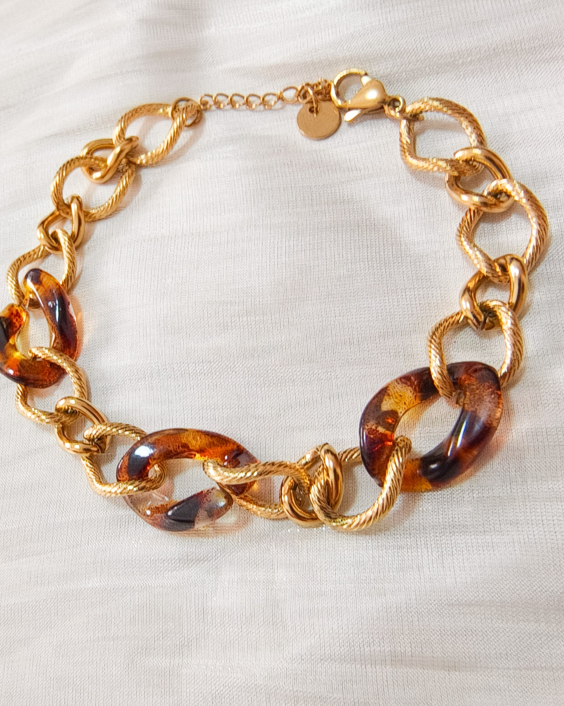 - Eslabones dorados trenzados con piezas de efecto carey súper chic.