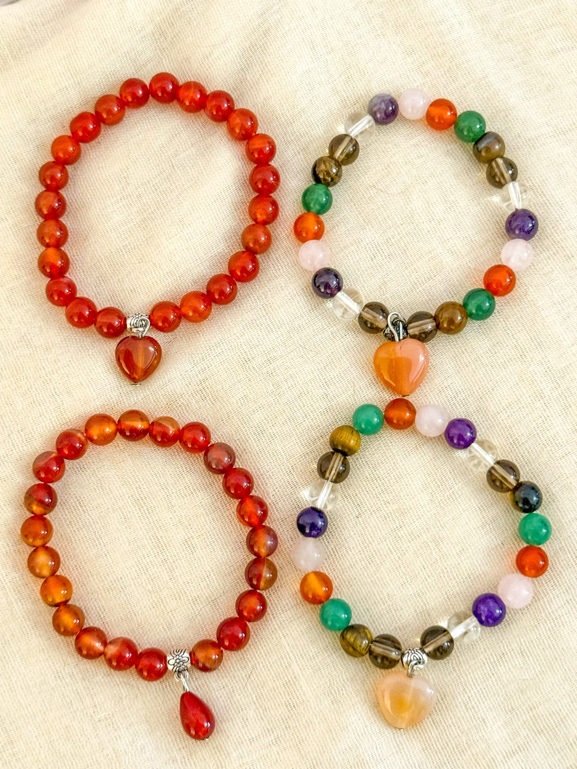 Descripción: Pulseras elásticas con cuentas en tonos oscuros o marrones, adornadas con colgantes en forma de corazón o gota. Atemporales, hipoalergénicas y fáciles de combinar. Llévalas solas para un estilo minimalista o en conjunto para un look más bohemio.