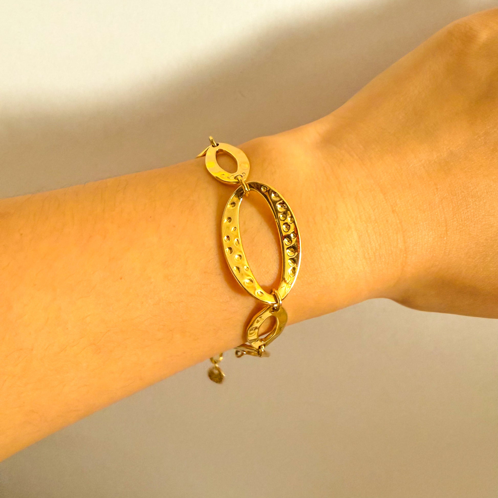 Los eslabones ovalados dorados se unen a una pieza central de mayor tamaño con textura artesanal, aportando carácter y sofisticación al conjunto.