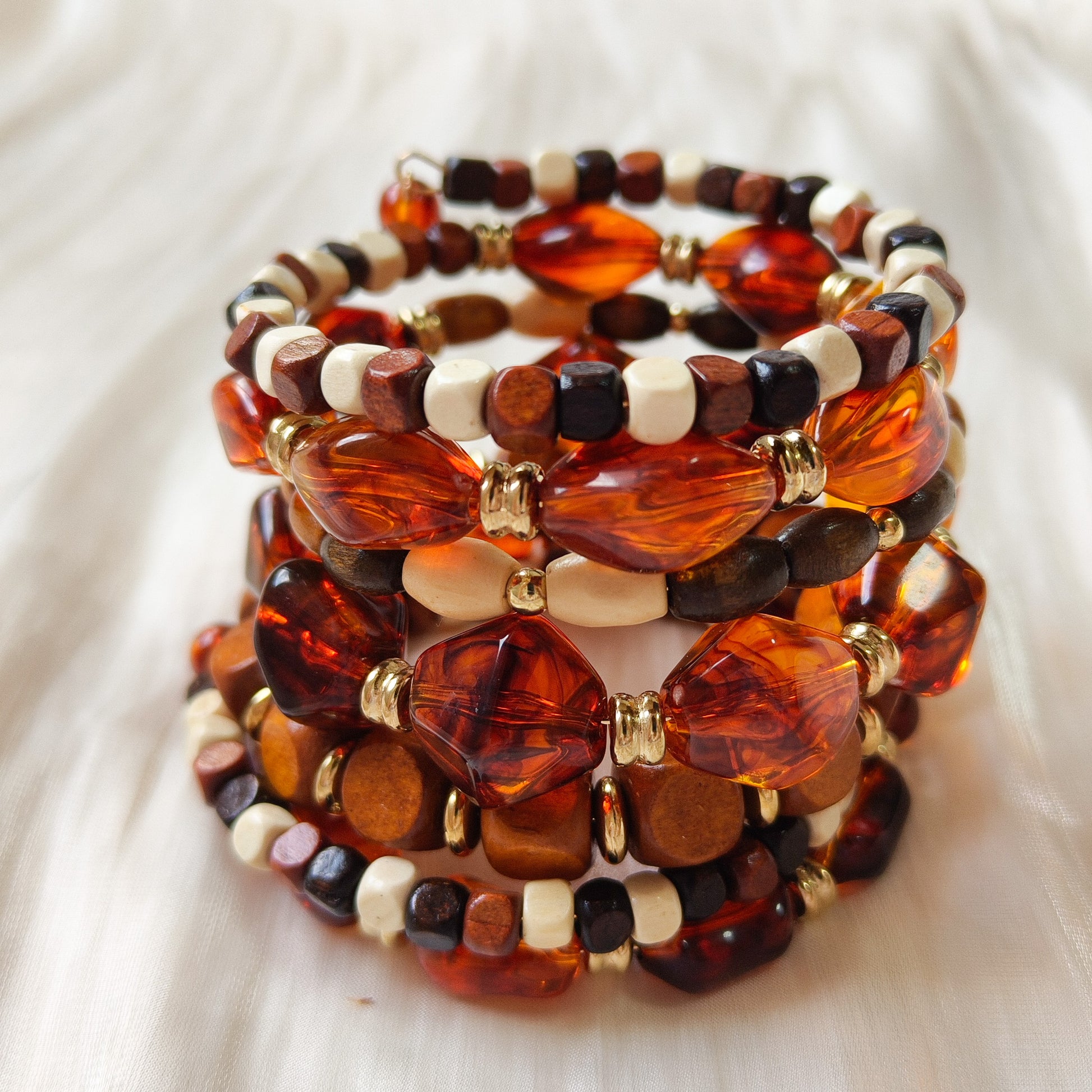 - Brazalete de memoria con cuentas miel, madera y detalles dorados.