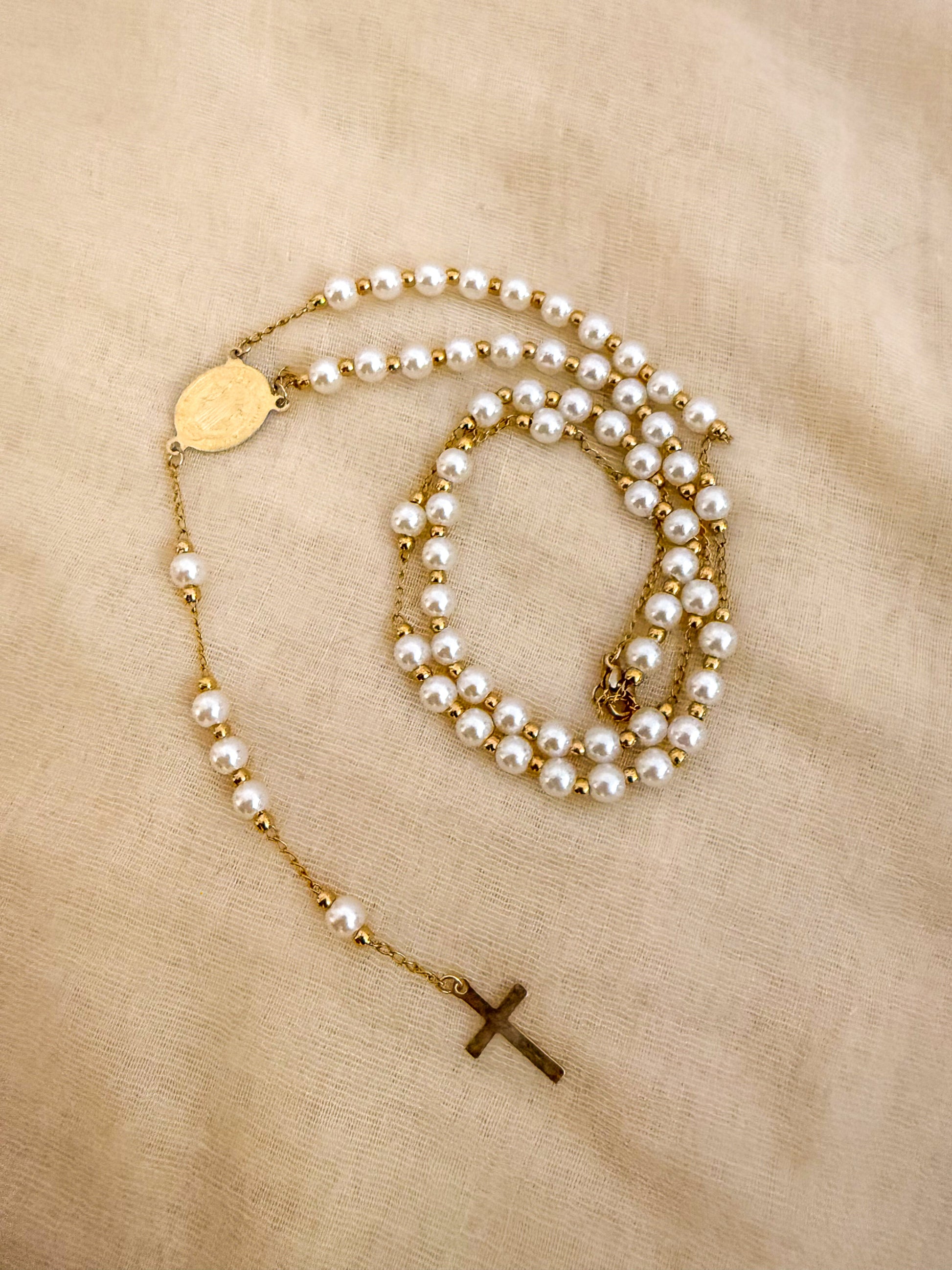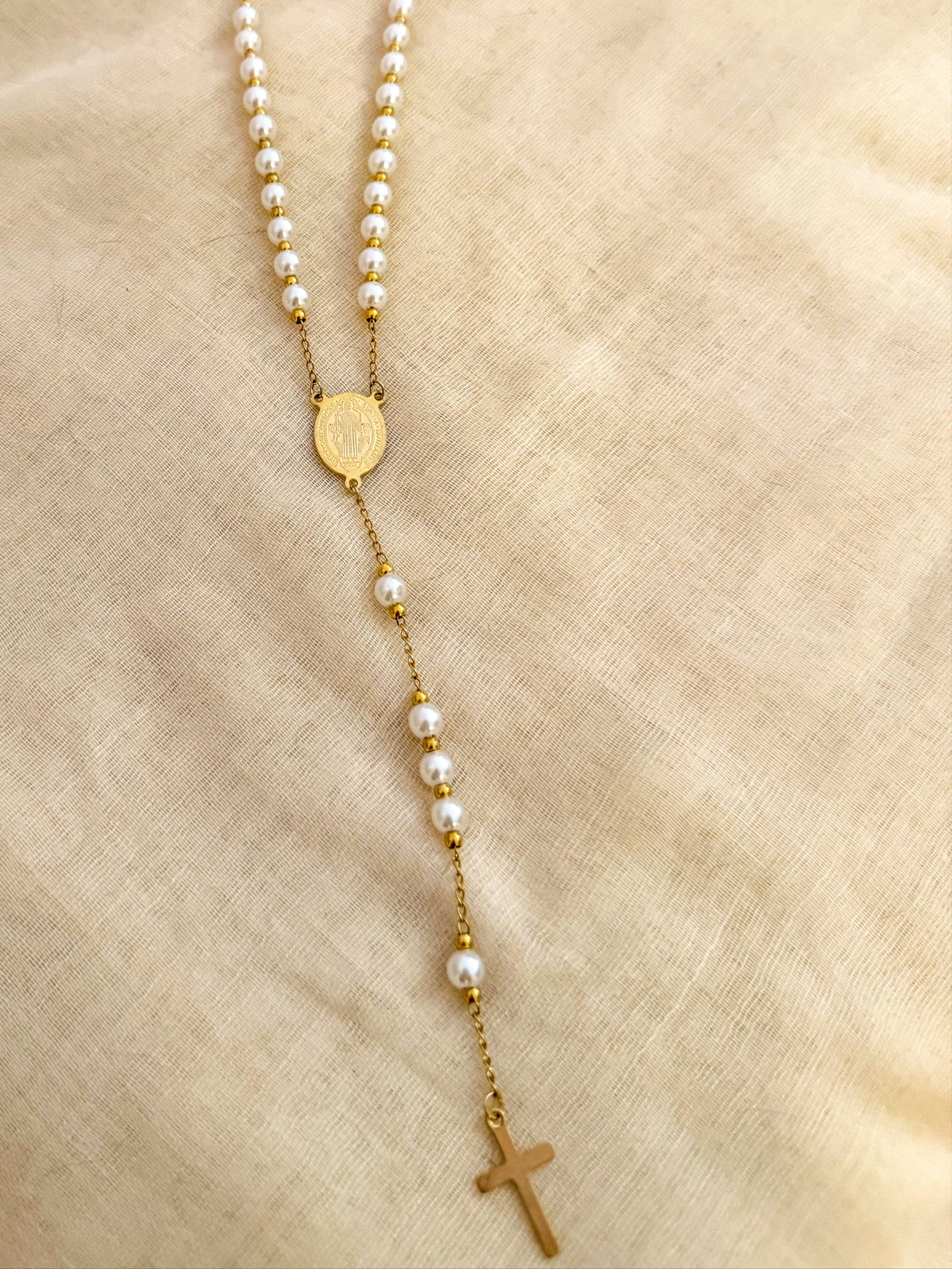 Descripción: Rosario con cuentas blancas y detalles dorados. Su estilo clásico aporta un toque de elegancia y serenidad al conjunto.